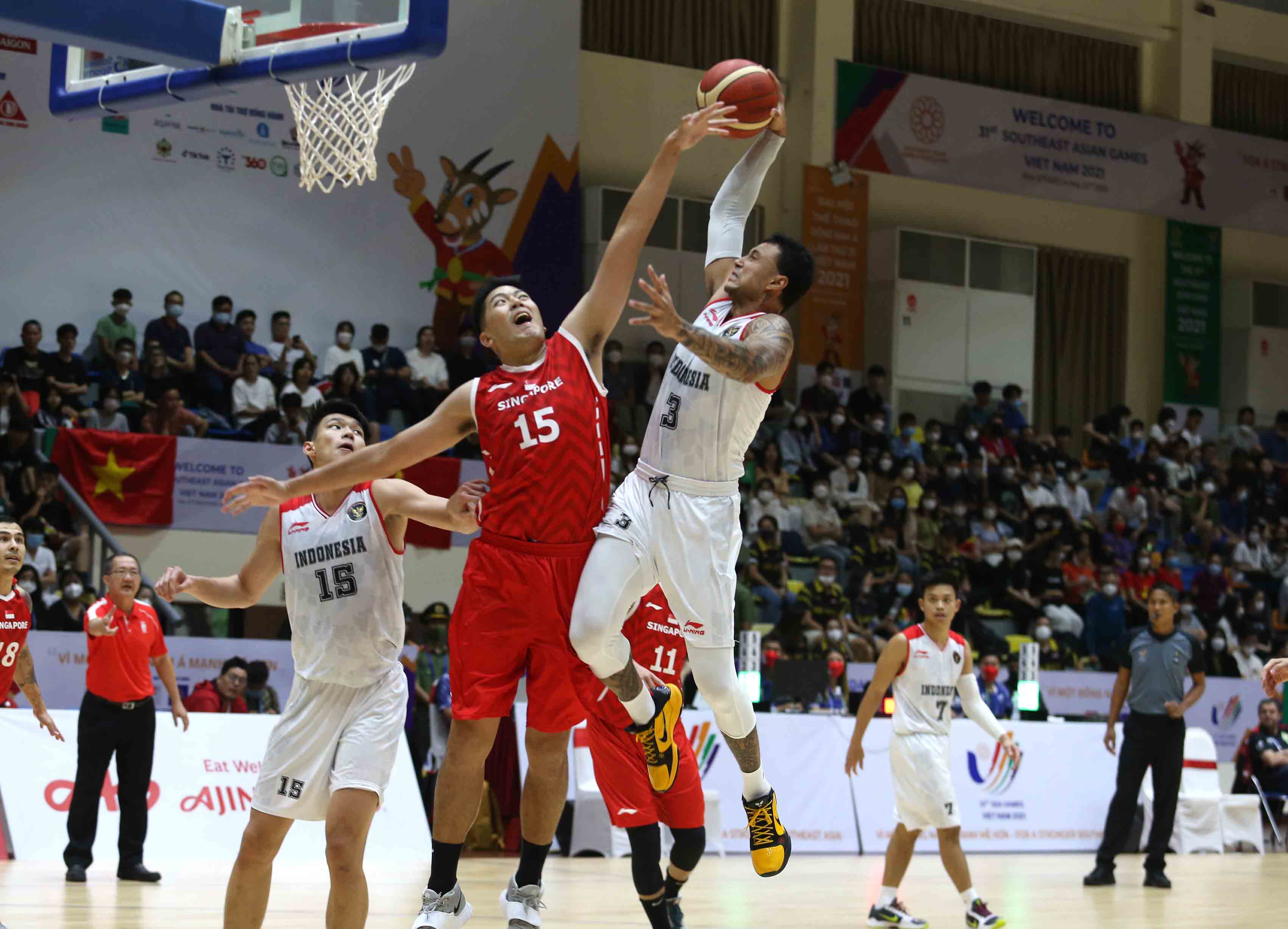 Brandon Jawato (3) mendapat penjagaan ketat dari pemain Singapura. Timnas basket putra Indonesia meraih kemenangan keempatnya di SEA Games 2021 dengan mengalahkan Singapura dengan skor 91-61 di Thanh Tri Gymnasium, Vietnam, Jumat 20 Mei 2022 (Photo : HO/Kemenpora/PP SIWO PWI/Erly Bahtiar/sportsmoment.id)