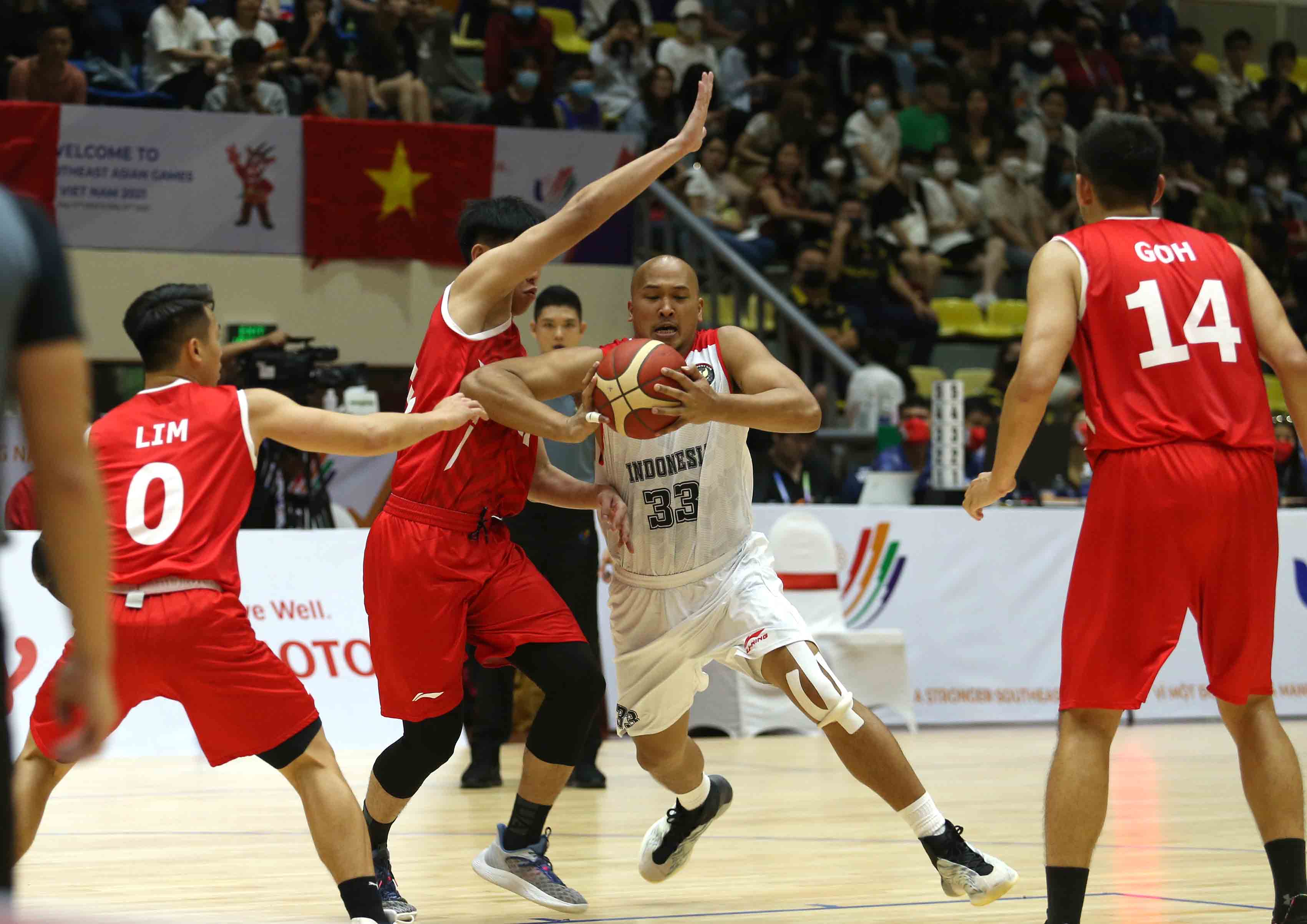 Pebasket Arki Dikania Wisnu (33) menerobos pertahanan Singapura. Timnas basket putra Indonesia meraih kemenangan keempatnya di SEA Games 2021 dengan mengalahkan Singapura dengan skor 91-61 di Thanh Tri Gymnasium, Vietnam, Jumat 20 Mei 2022 (Photo : HO/Kemenpora/PP SIWO PWI/Erly Bahtiar/sportsmoment.id)