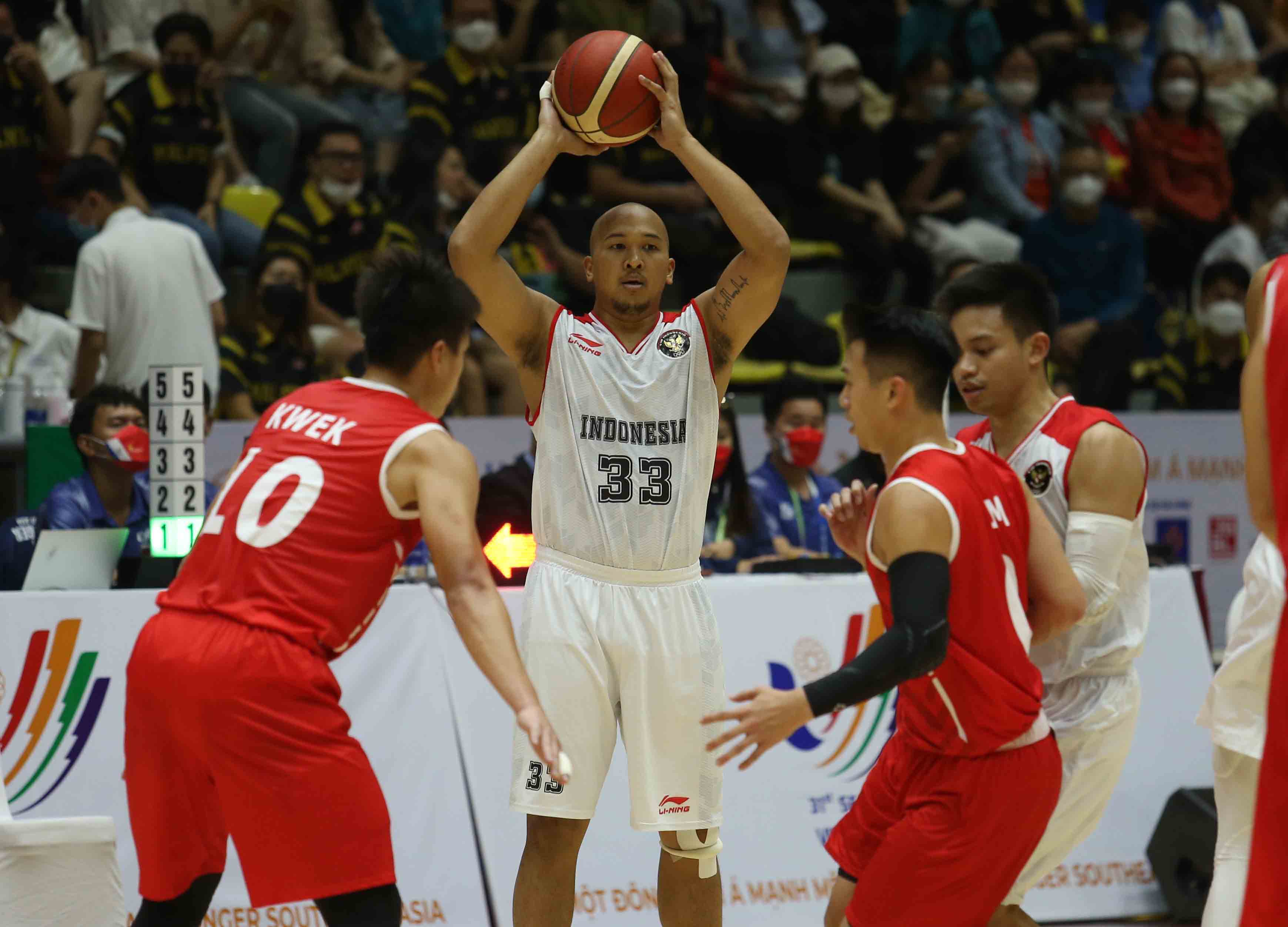 Pebasket timnas Indonesia, Arki Dikania Wisnu (33) bersiap mengumpan bola kepada rekannya. Timnas basket putra Indonesia meraih kemenangan keempatnya di SEA Games 2021 dengan mengalahkan Singapura dengan skor 91-61 di Thanh Tri Gymnasium, Vietnam, Jumat 20 Mei 2022 (Photo : HO/Kemenpora/PP SIWO PWI/Erly Bahtiar/sportsmoment.id)