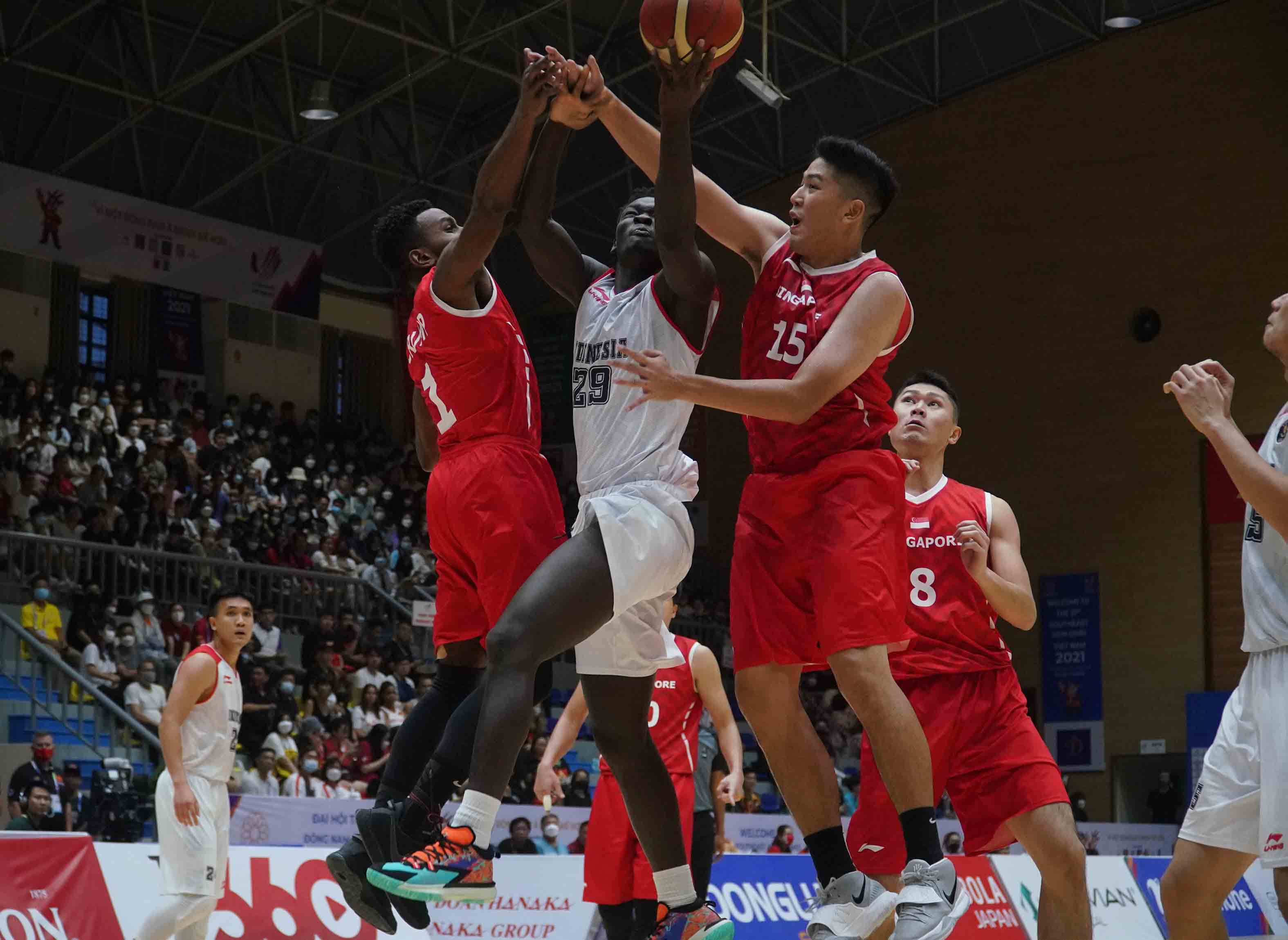 Pebasket timnas Indonesia, Dame Diagne (29) mendapat kawalan dari pebasket Singapura. Timnas basket putra Indonesia meraih kemenangan keempatnya di SEA Games 2021 dengan mengalahkan Singapura dengan skor 91-61 di Thanh Tri Gymnasium, Vietnam, Jumat 20 Mei 2022 (Photo : HO/Kemenpora/PP SIWO PWI/Erly Bahtiar/sportsmoment.id)