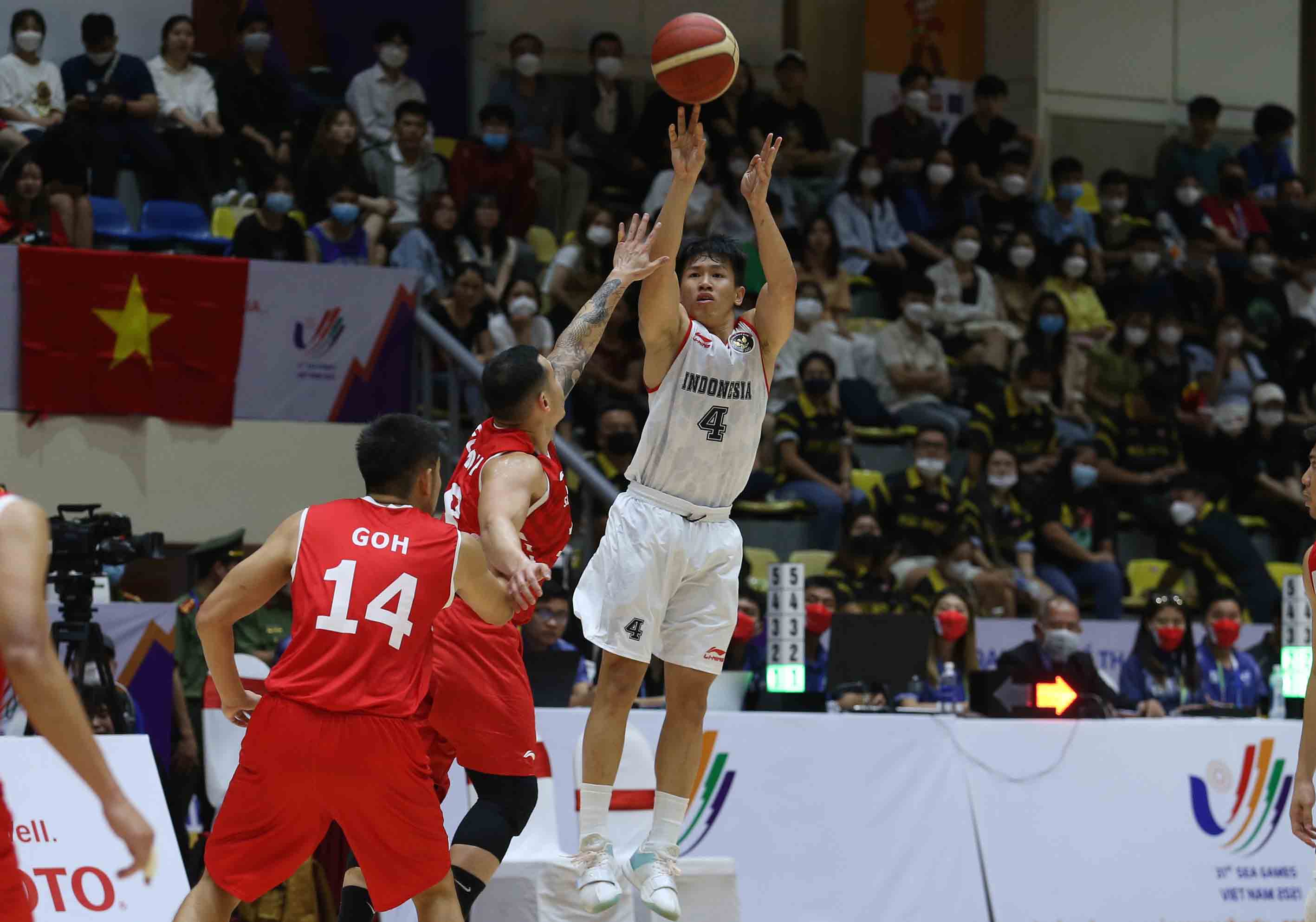 Pebasket timnas Indonesia, Abraham Damar (4) melempar bola ke arah ring Singapura. Timnas basket putra Indonesia meraih kemenangan keempatnya di SEA Games 2021 dengan mengalahkan Singapura dengan skor 91-61 di Thanh Tri Gymnasium, Vietnam, Jumat 20 Mei 2022 (Photo : HO/Kemenpora/PP SIWO PWI/Erly Bahtiar/sportsmoment.id)