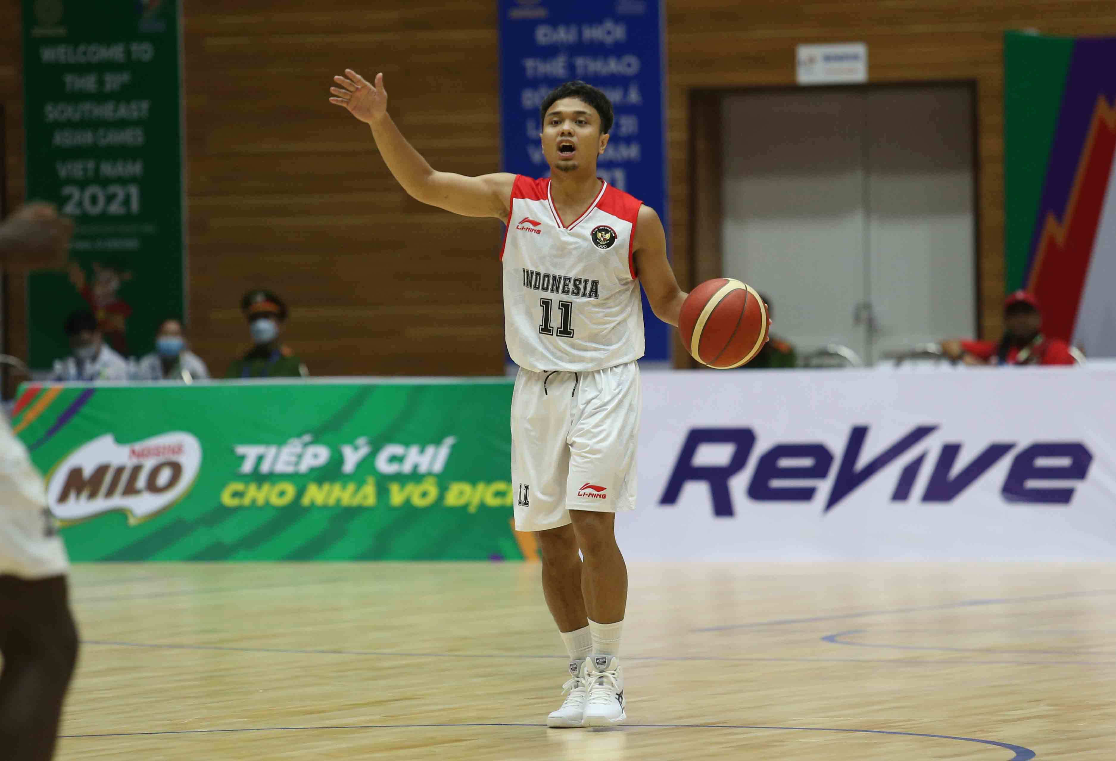 Pebasket timnas Indonesia, Yudha Saputera (11) bersiap melakukan serangan ke arah lawan. Timnas basket putra Indonesia meraih kemenangan keempatnya di SEA Games 2021 dengan mengalahkan Singapura dengan skor 91-61 di Thanh Tri Gymnasium, Vietnam, Jumat 20 Mei 2022 (Photo : HO/Kemenpora/PP SIWO PWI/Erly Bahtiar/sportsmoment.id)