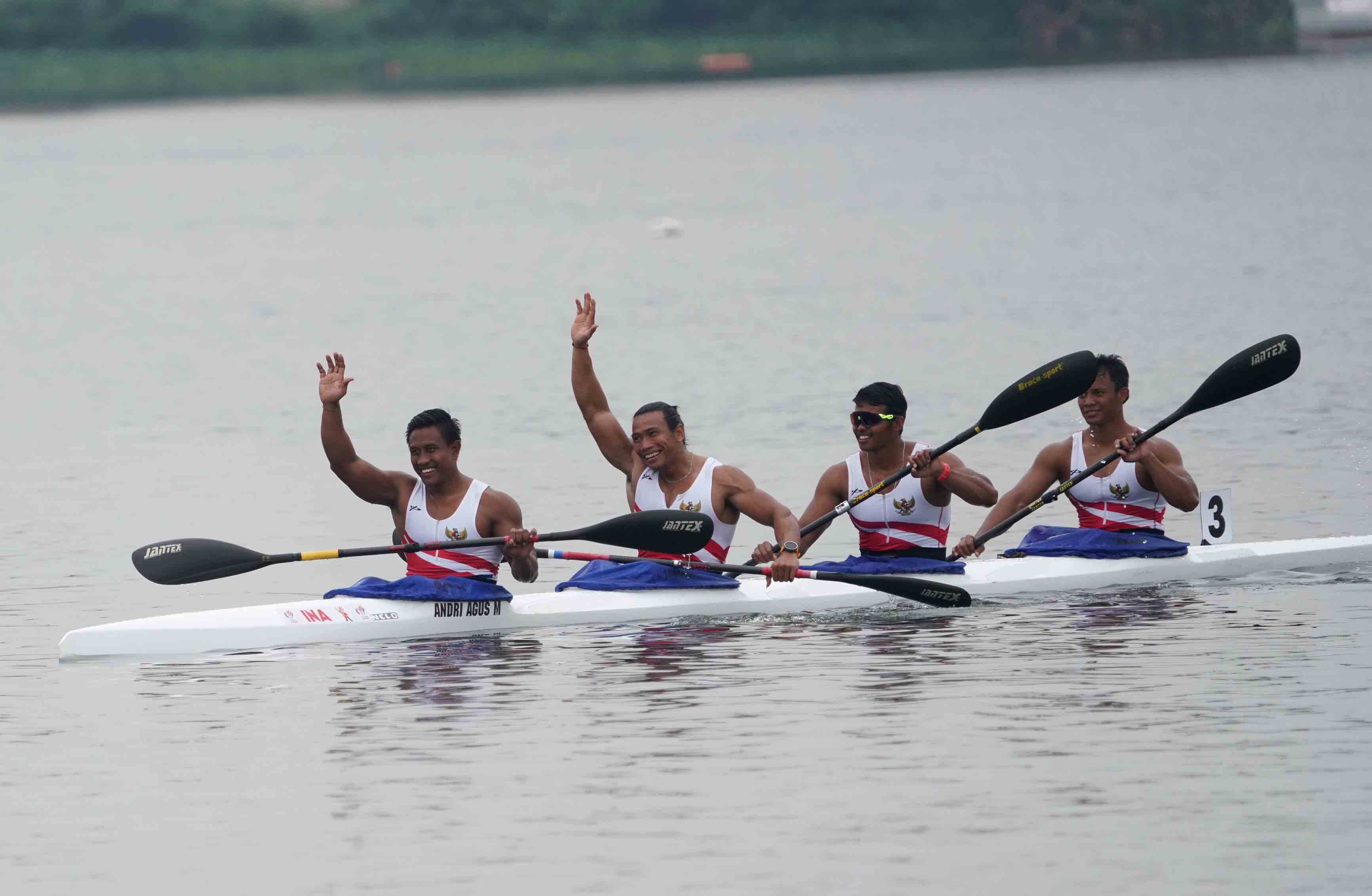 Tim Canoeing Putra Indonesia yang terdiri dari Maizer Riyodra, Mugi Harjito, Joko Andriyanto dan Andri Agus Mulyana berhasil meraih medali Emas pada nomor MK4 500 dengan catatan waktu 01:29:562 di Ha Phong, Vietnam, Sabtu, 21 Mei 2022 (Photo : HO/Kemenpora/PP SIWO PWI/Erly Bahtiar/sportsmoment.id)