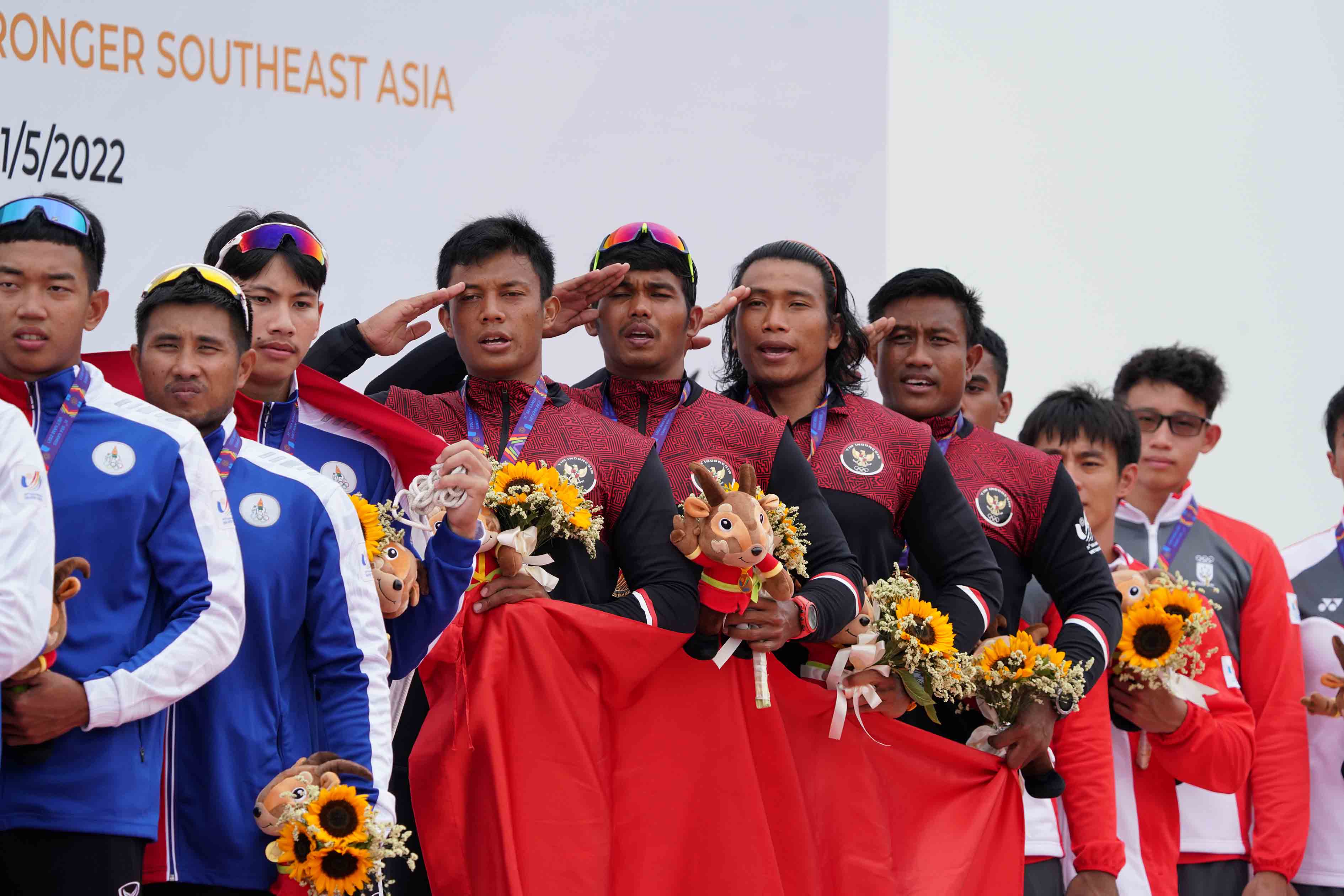 Tim Canoeing Indonesia yang terdiri dari Maizer Riyodra, Mugi Harjito, Joko Andriyanto dan Andri Agus Mulyana berhasil meraih medali Emas pada nomor MK4 500 dengan catatan waktu 01:29:562 di Ha Phong, Vietnam, Sabtu, 21 Mei 2022 (Photo : HO/Kemenpora/PP SIWO PWI/Erly Bahtiar/sportsmoment.id)
