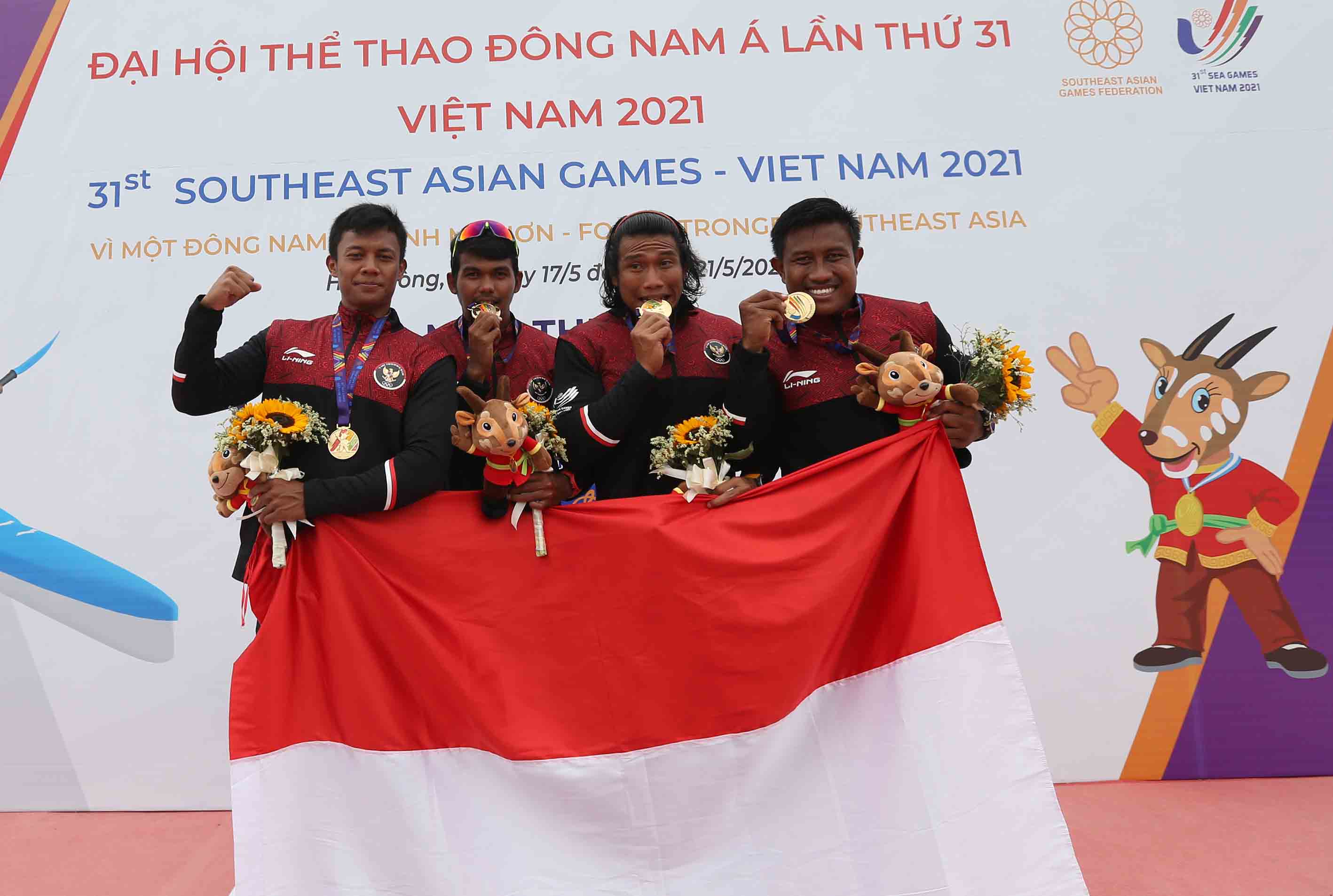 Tim Canoeing Indonesia yang terdiri dari Maizer Riyodra, Mugi Harjito, Joko Andriyanto dan Andri Agus Mulyana berhasil meraih medali Emas pada nomor MK4 500 dengan catatan waktu 01:29:562 di Ha Phong, Vietnam, Sabtu, 21 Mei 2022 (Photo : HO/Kemenpora/PP SIWO PWI/Erly Bahtiar/sportsmoment.id)
