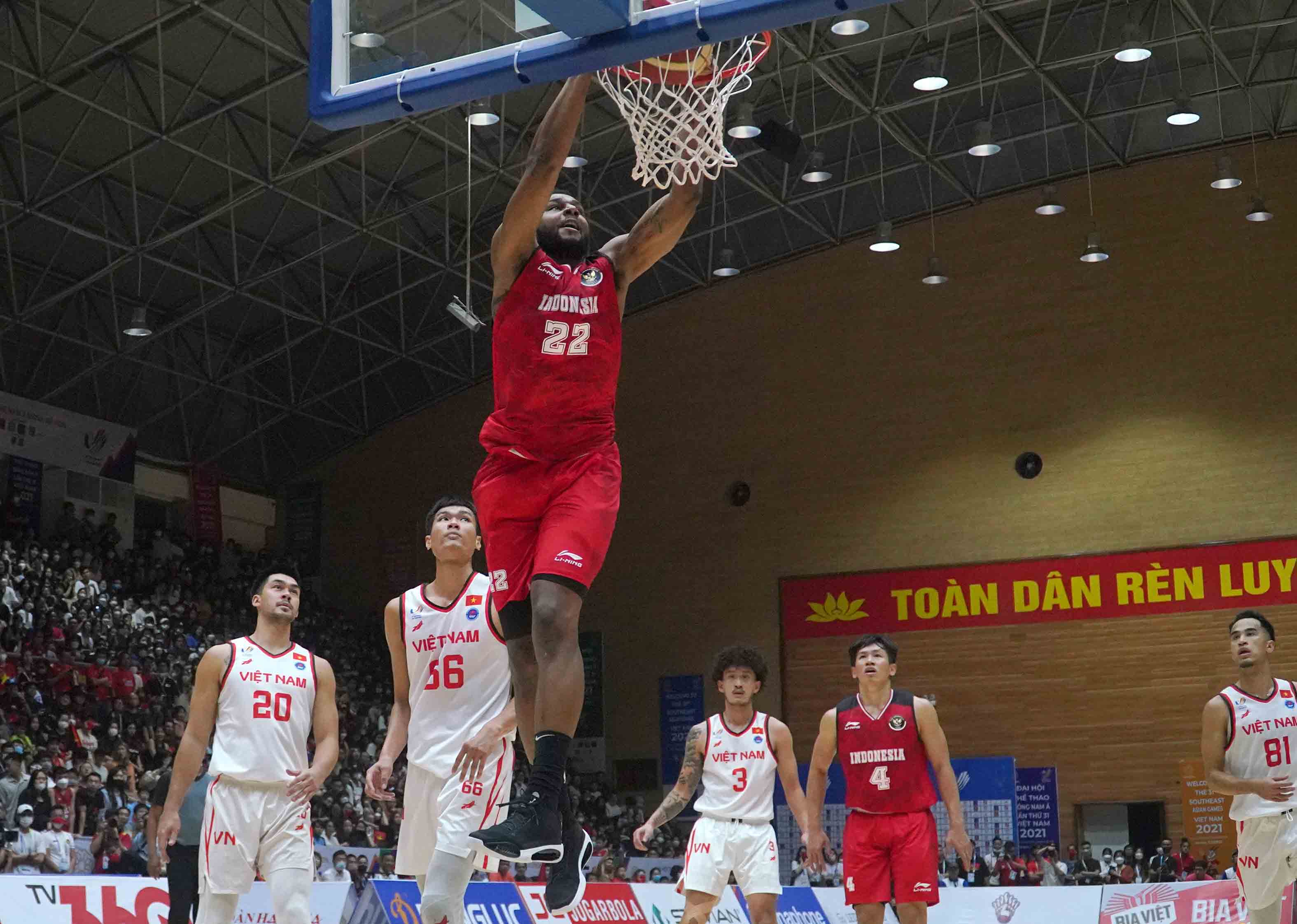 Pebasket timnas Indonesia, Marques Terrell (22) berhasil memasukkan bola kedalam ring tim basket Vietnam. Timnas basket putra Indonesia kembali meraih kemenangan di babak round robin SEA Games 2021 dengan mengalahkan Vietnam dengan skor 94-67 di Thanh Tri Gymnasium, Vietnam, Sabtu 21 Mei 2022 . Dengan kemenangan ini Indonesia akan berebut emas melawan Filipina di laga Final (Photo : HO/Kemenpora/PP SIWO PWI/Erly Bahtiar/sportsmoment.id)