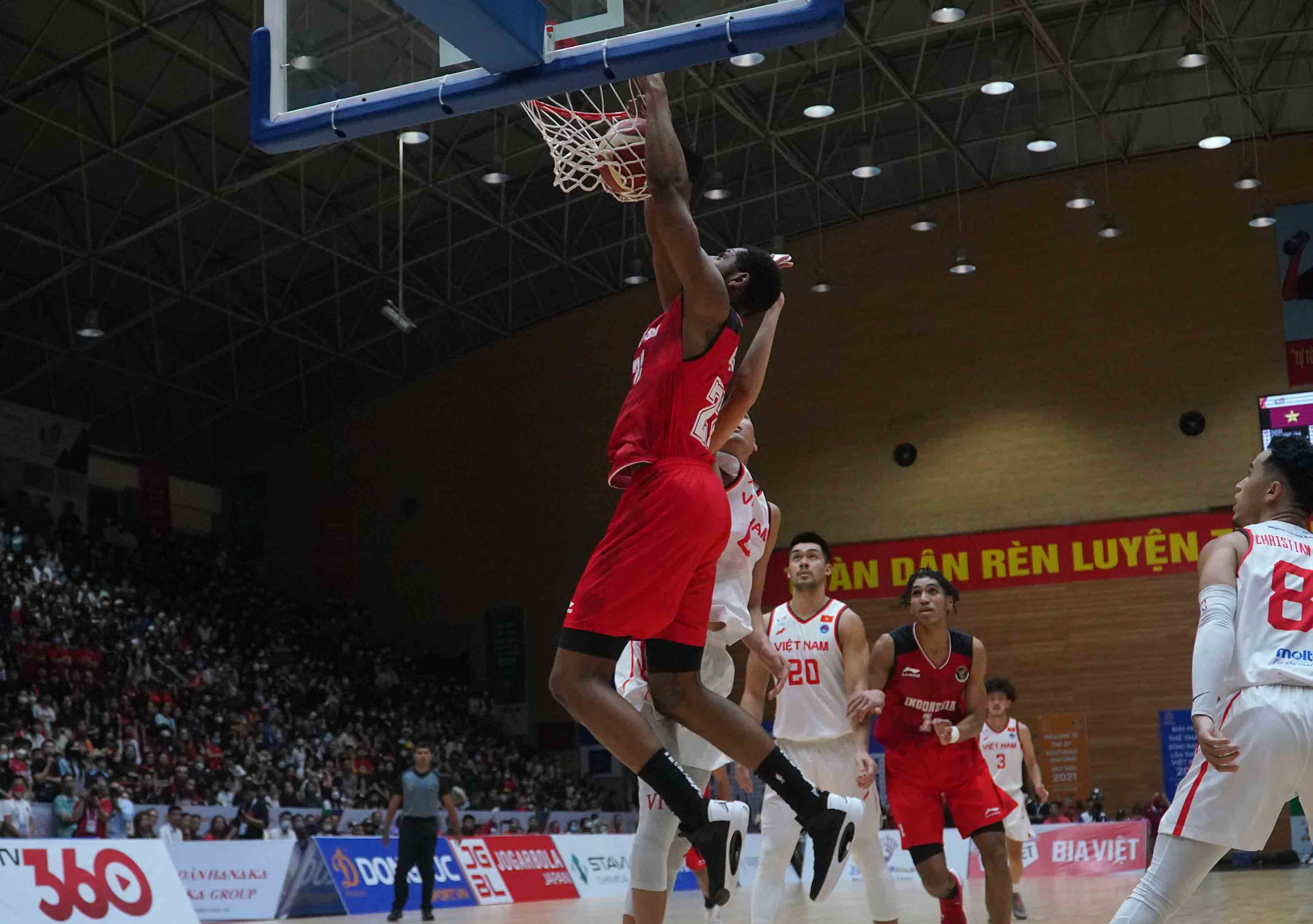 Pebasket timnas Indonesia, Marques Terrell (22) berhasil memasukkan bola kedalam ring tim basket Vietnam. Timnas basket putra Indonesia kembali meraih kemenangan di babak round robin SEA Games 2021 dengan mengalahkan Vietnam dengan skor 94-67 di Thanh Tri Gymnasium, Vietnam, Sabtu 21 Mei 2022 . Dengan kemenangan ini Indonesia akan berebut emas melawan Filipina di laga Final (Photo : HO/Kemenpora/PP SIWO PWI/Erly Bahtiar/sportsmoment.id)