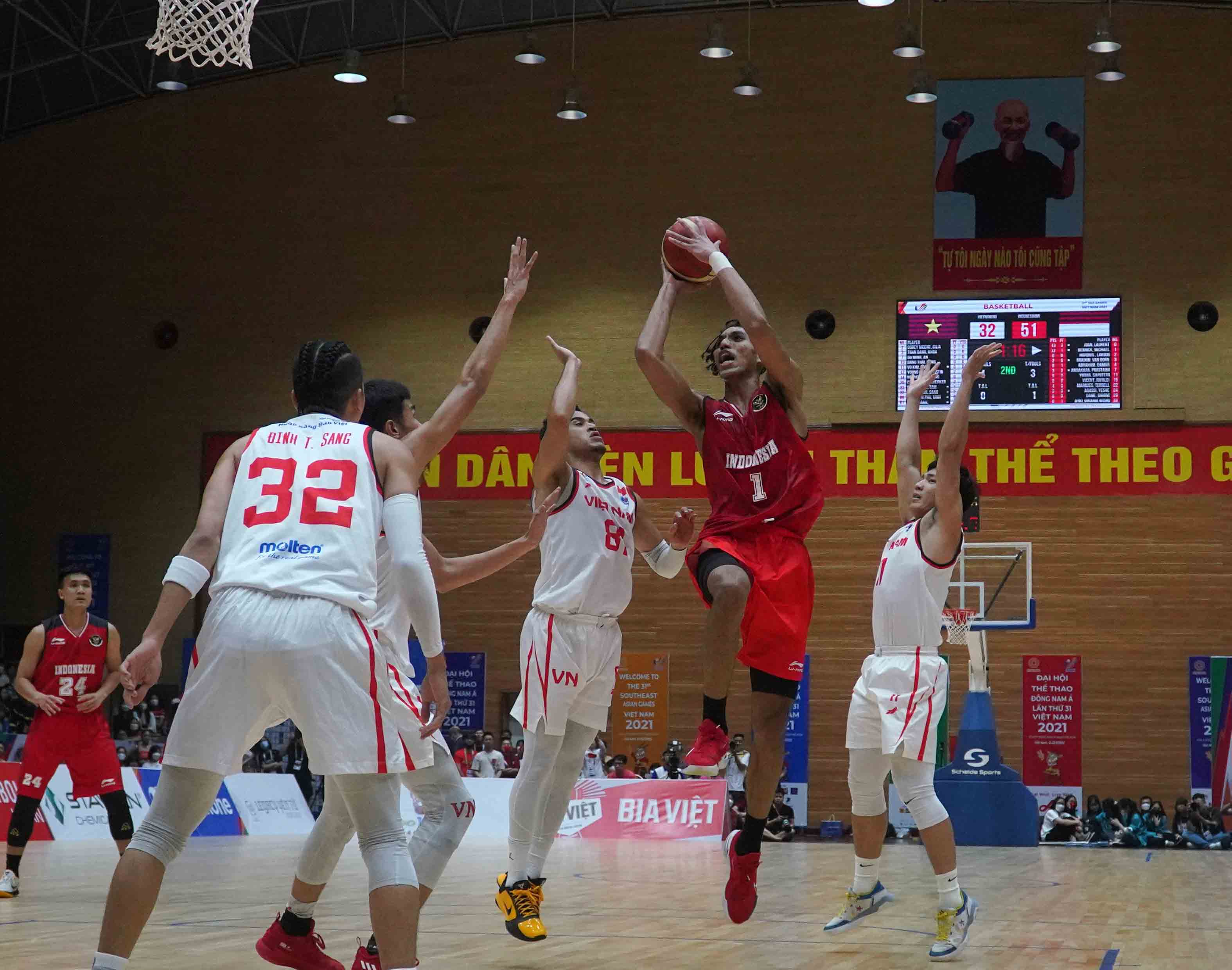 Pebasket timnas Indonesia, Derrick Michael (1) mendapat kawalan dari pebasket Vietnam. Timnas basket putra Indonesia kembali meraih kemenangan di babak round robin SEA Games 2021 dengan mengalahkan Vietnam dengan skor 94-67 di Thanh Tri Gymnasium, Vietnam, Sabtu 21 Mei 2022 . Dengan kemenangan ini Indonesia akan berebut emas melawan Filipina di laga Final (Photo : HO/Kemenpora/PP SIWO PWI/Erly Bahtiar/sportsmoment.id)