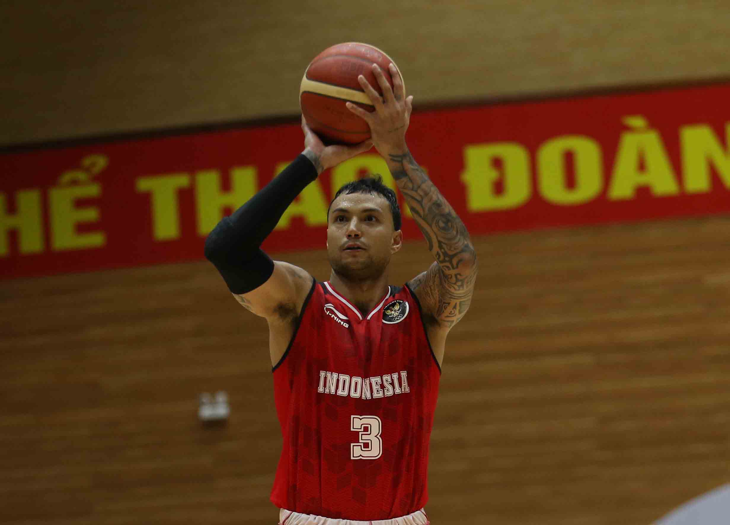 Pebasket timnas Indonesia, Brandon Jawato (3) melakukan free throw ke arah ring tim basket Vietnam. Timnas basket putra Indonesia kembali meraih kemenangan di babak round robin SEA Games 2021 dengan mengalahkan Vietnam dengan skor 94-67 di Thanh Tri Gymnasium, Vietnam, Sabtu 21 Mei 2022 . Dengan kemenangan ini Indonesia akan berebut emas melawan Filipina di laga Final (Photo : HO/Kemenpora/PP SIWO PWI/Erly Bahtiar/sportsmoment.id)