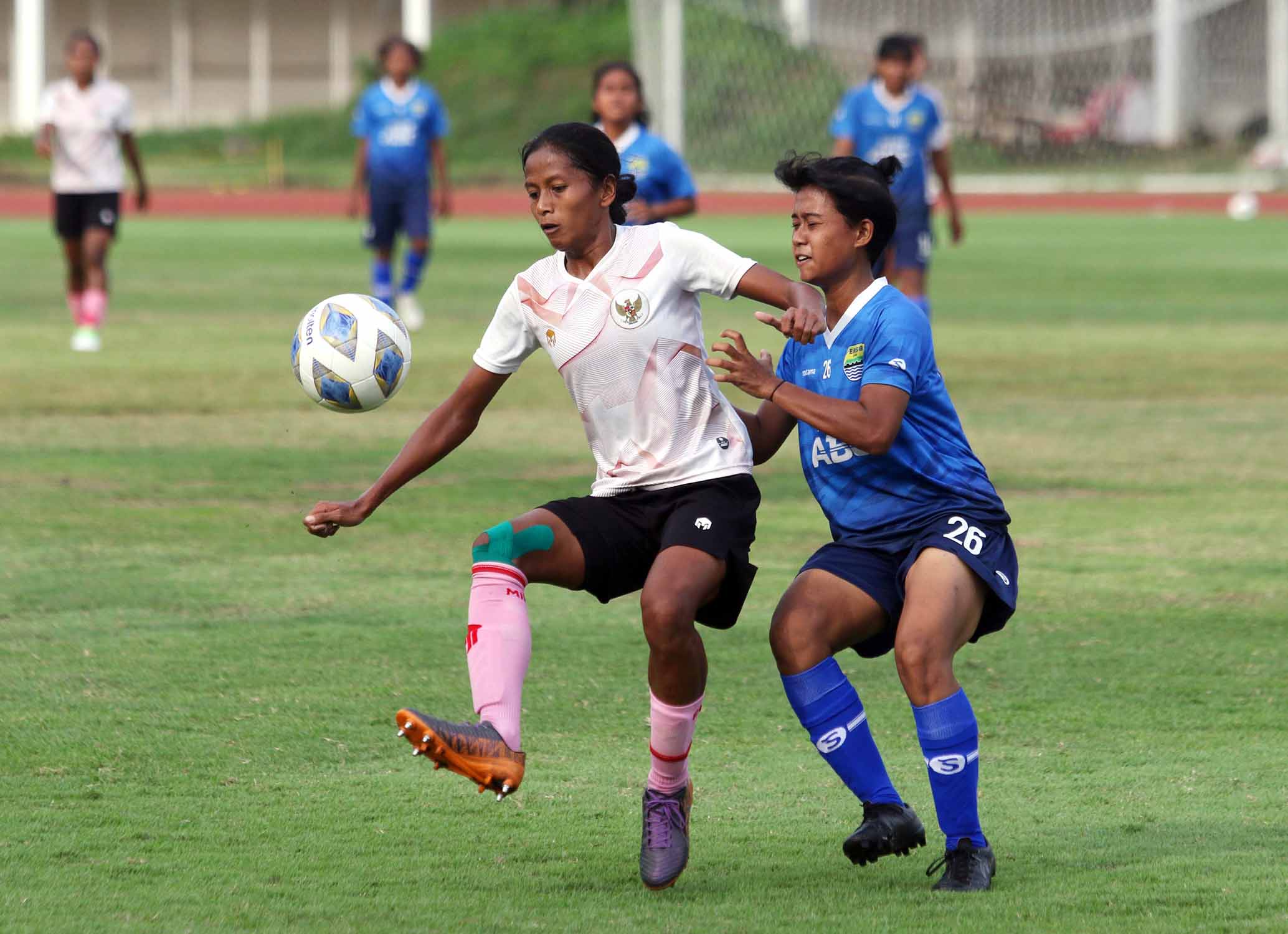 Para pemain sepakbola tim Nasional wanita Indonesia beraksi pada laga ujicoba menghadapi tim putri Persib Bandung di Stadion Madya, Senayan Jakarta, Kamis (13/1/2022). Laga ujicoba tersebut sebagai rangkaian persiapan Skuad Garuda Pertiwi ke Piala Asia 2022 India. (Foto:Adelio Putra/Sportmoment.id)