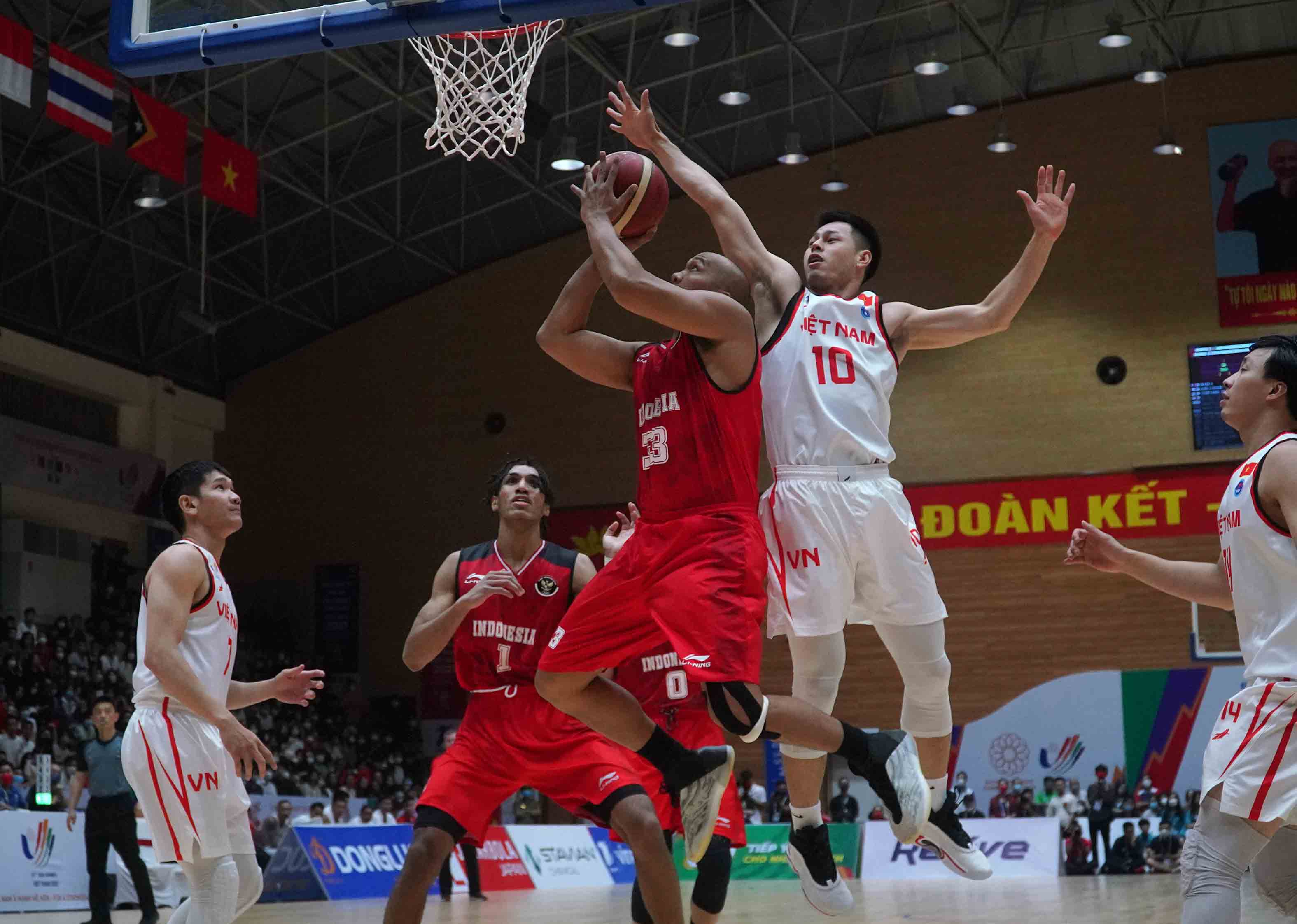 Pebasket timnas Indonesia, Arki Dikania Wisnu (33) mendapat kawalan dari pebasket Vietnam. Timnas basket putra Indonesia kembali meraih kemenangan di babak round robin SEA Games 2021 dengan mengalahkan Vietnam dengan skor 94-67 di Thanh Tri Gymnasium, Vietnam, Sabtu 21 Mei 2022 . Dengan kemenangan ini Indonesia akan berebut emas melawan Filipina di laga Final (Photo : HO/Kemenpora/PP SIWO PWI/Erly Bahtiar/sportsmoment.id)
