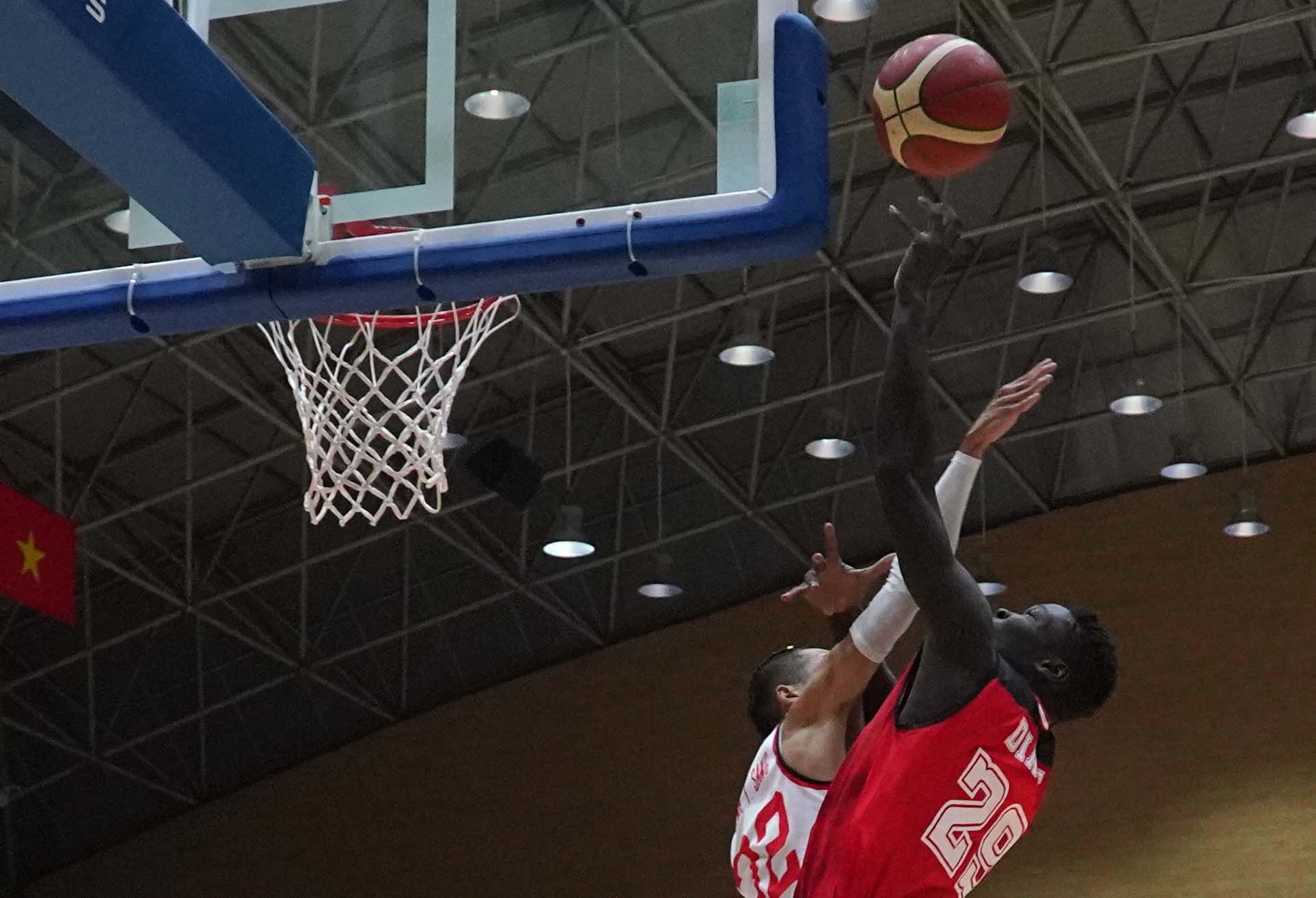 Pebasket timnas Indonesia, Dame Diagne (29) mendapat kawalan dari pebasket Vietnam. Timnas basket putra Indonesia kembali meraih kemenangan di babak round robin SEA Games 2021 dengan mengalahkan Vietnam dengan skor 94-67 di Thanh Tri Gymnasium, Vietnam, Sabtu 21 Mei 2022 . Dengan kemenangan ini Indonesia akan berebut emas melawan Filipina di laga Final (Photo : HO/Kemenpora/PP SIWO PWI/Erly Bahtiar/sportsmoment.id)
