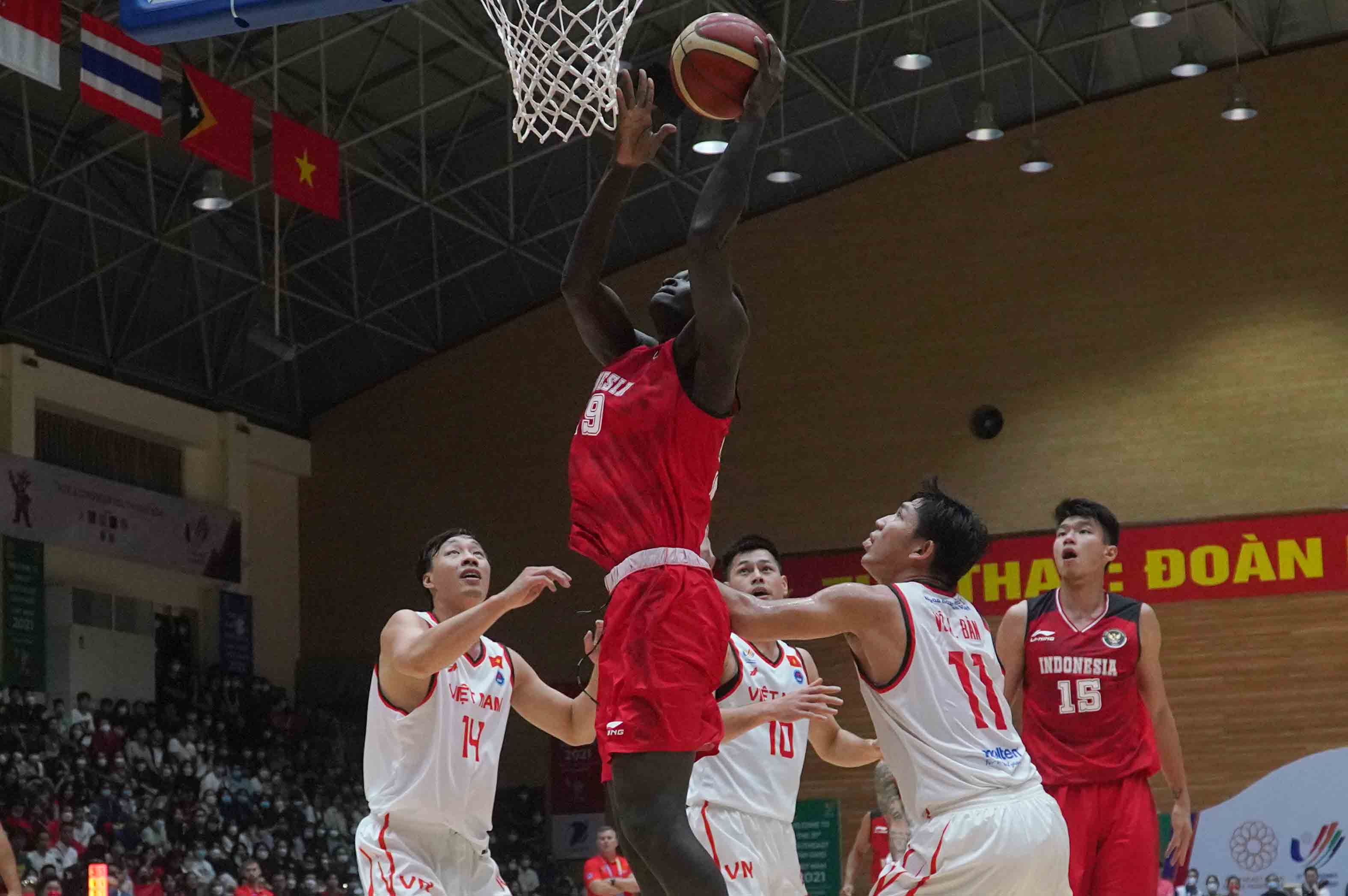 Pebasket timnas Indonesia, Dame Diagne (29) mendapat kawalan dari pebasket Vietnam. Timnas basket putra Indonesia kembali meraih kemenangan di babak round robin SEA Games 2021 dengan mengalahkan Vietnam dengan skor 94-67 di Thanh Tri Gymnasium, Vietnam, Sabtu 21 Mei 2022 . Dengan kemenangan ini Indonesia akan berebut emas melawan Filipina di laga Final (Photo : HO/Kemenpora/PP SIWO PWI/Erly Bahtiar/sportsmoment.id)