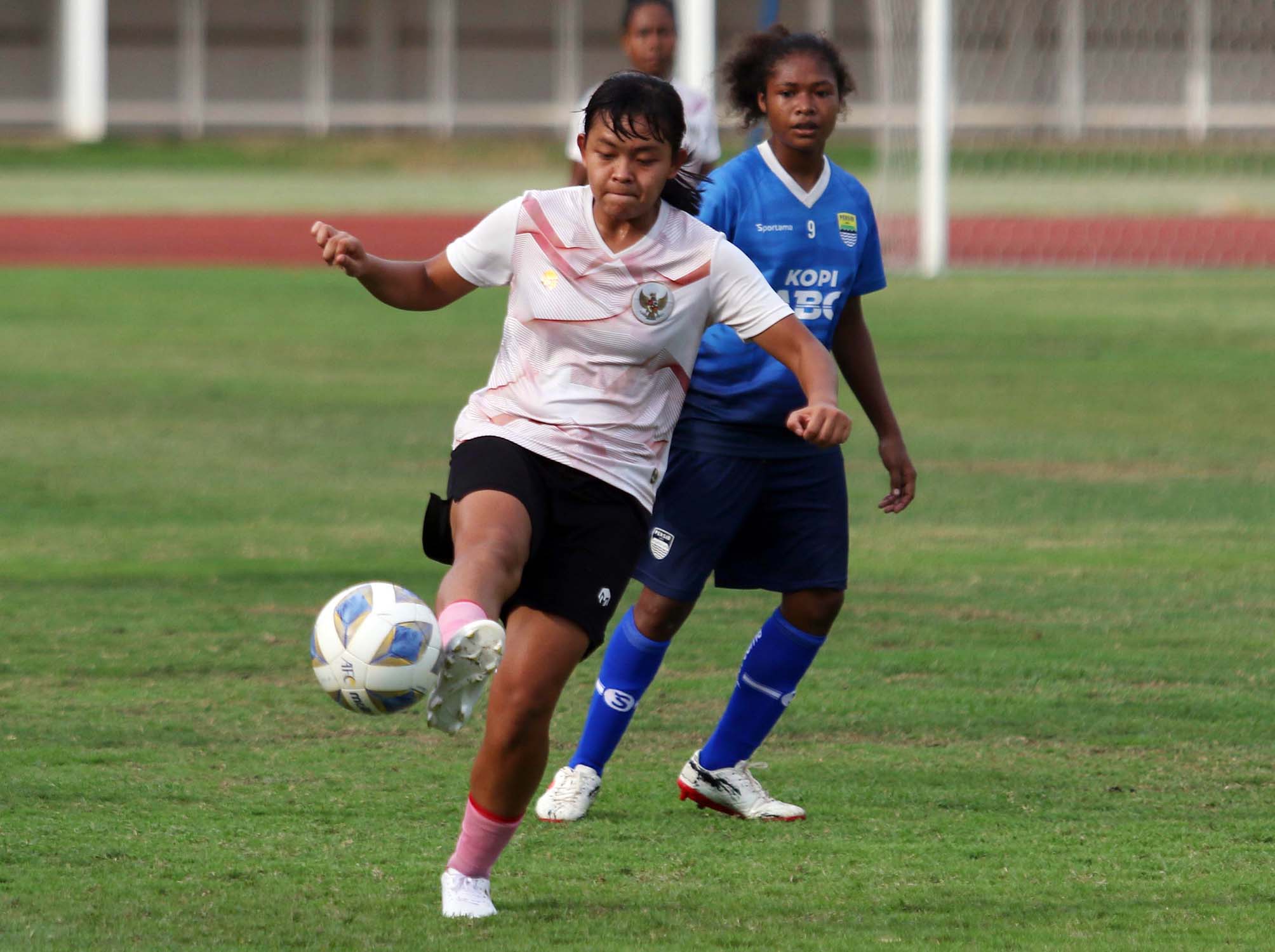 Para pemain sepakbola tim Nasional wanita Indonesia beraksi pada laga ujicoba menghadapi tim putri Persib Bandung di Stadion Madya, Senayan Jakarta, Kamis (13/1/2022). Laga ujicoba tersebut sebagai rangkaian persiapan Skuad Garuda Pertiwi ke Piala Asia 2022 India. (Foto:Adelio Putra/Sportmoment.id)