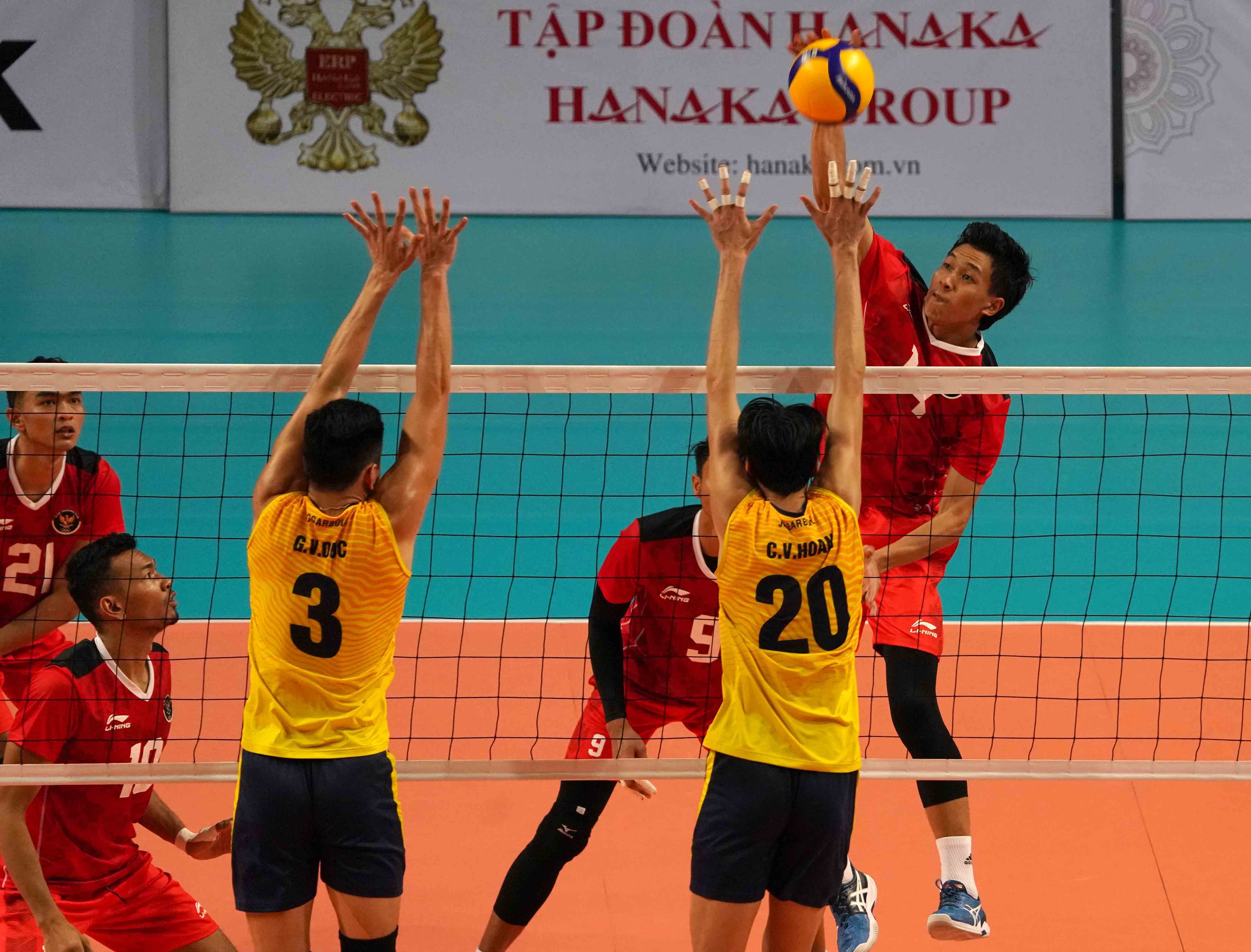 Pemain timnas Indonesia, Farhan Halim (14) mengarahkan pukulan smashnya ke area lawan. Timnas bola voli putra Indonesia berhasil mempertahankan gelar juara di SEA Games 2021 dengan mengalahkan Vietnam dengan skor 3-0 di Dai Yan Sports Arena, Quang Ninh Vietnam, Minggu, 22 Mei 2022 (Photo : HO/Kemenpora/PP SIWO PWI/Erly Bahtiar/sportsmoment.id)
