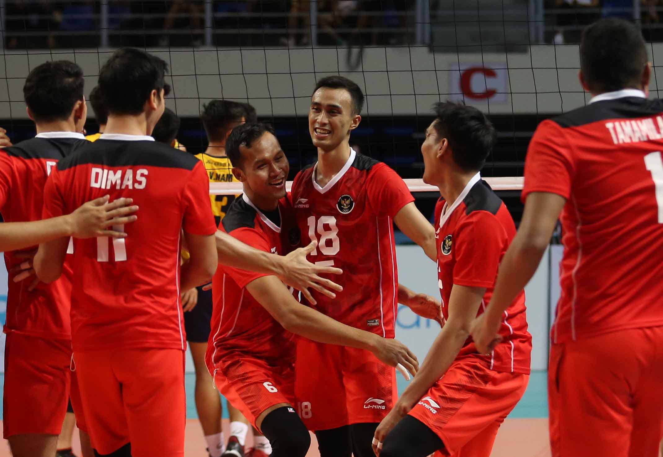 Pemain timnas Indonesia meluapkan emosi kegembiraan setelah berhasil meraih poin. Timnas bola voli putra Indonesia berhasil mempertahankan gelar juara di SEA Games 2021 dengan mengalahkan Vietnam dengan skor 3-0 di Dai Yan Sports Arena, Quang Ninh Vietnam, Minggu, 22 Mei 2022 (Photo : HO/Kemenpora/PP SIWO PWI/Erly Bahtiar/sportsmoment.id)