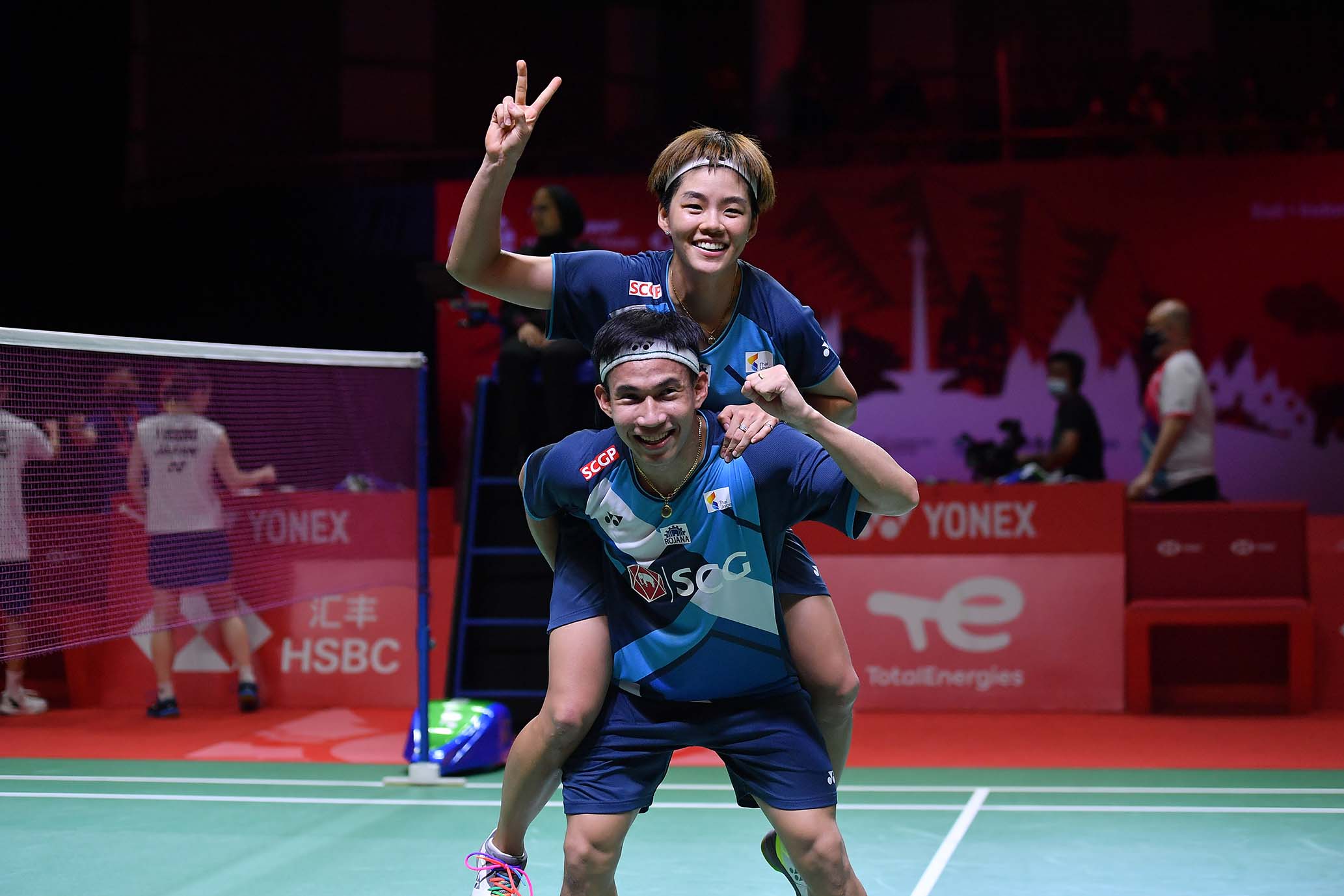 Pasangan ganda campuran Thailand, Dechapol Puavaranukroh/Sapsiree Taerattanachai sukses meraih gelar juara BWF World Tour Finals 2021. Kepastian gelar juara didapat Dechapol/Sapsiree setelah menuntaskan perlawanan ganda putri Jepang, Yuta Watanabe/Arisa Higashino di partai final BWF World Tour Finals 2021, Minggu (5/12/2021) di Bali International Convention Centre, Nusa Dua, Bali, dengan menang straight game 21-19 dan 21-11 dalam tempo 40 menit. (Foto:HO/HUMAS PP PBSI/SPORTSMOMENT.ID)