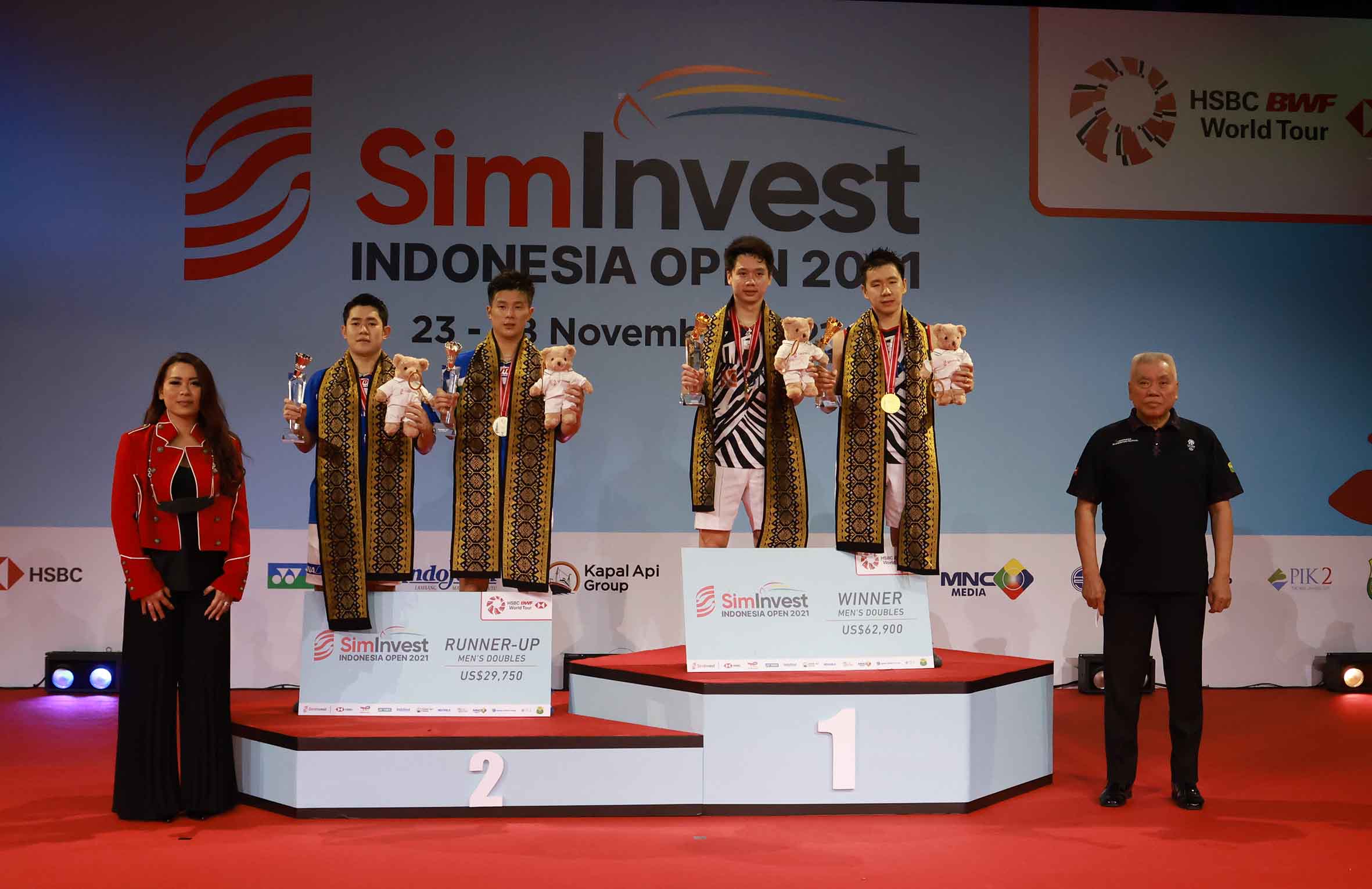 Indonesia sukses meraih gelar juara di nomor ganda putra Indonesia Open 2021 setelah pasangan Kevin Sanjaya Sukamuljo / Marcus Ferinaldi Gideon sukses menumbangkan ganda Jepang, Takuro Hoki / Yugo Kobayashi dua gim langsung, 21-14 dan 21-18 pada partai final, Minggu (28/11/2021).(Foto:HO/HUMAS PP PBSI/SPORTSMOMENT.ID)