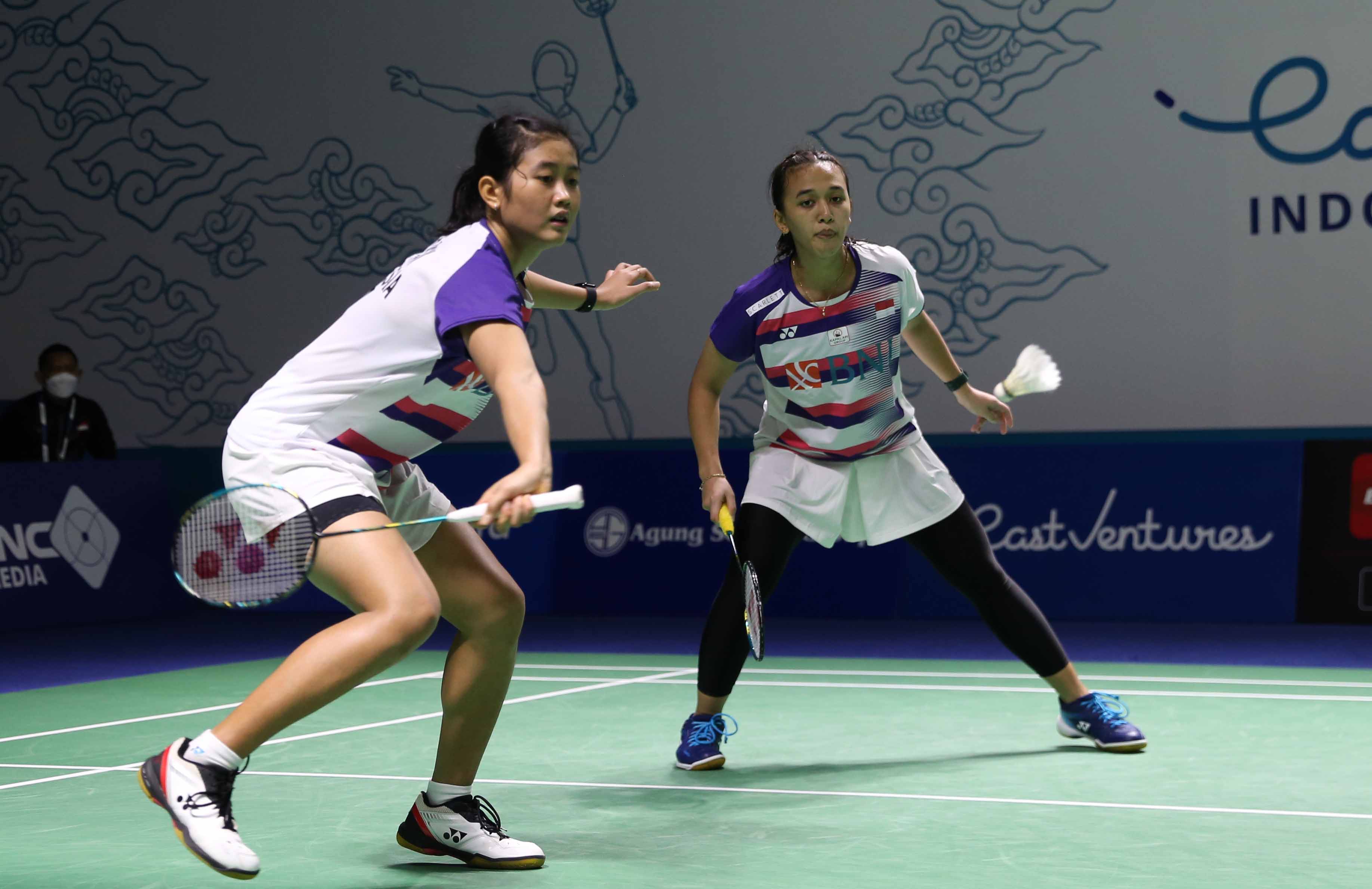 Febriana Dwipuji Kusuma/Amalia Cahaya Kusuma (INA) mengalahkan ganda putri Prancis, Morgot Lambert/Anne Tran melalui pertarungan tiga gim, 21-19, 17-21 dan 21-15 pada babak pertama gelaran turnamen bulutangkis East Ventures Indonesia Open 2022 di Istora Gelora Bung Karno Senayan, Jakarta, 15 Juni 2022 (Foto : HO/Humas PP PBSI/Erly Bahtiar/Sportsmoment),