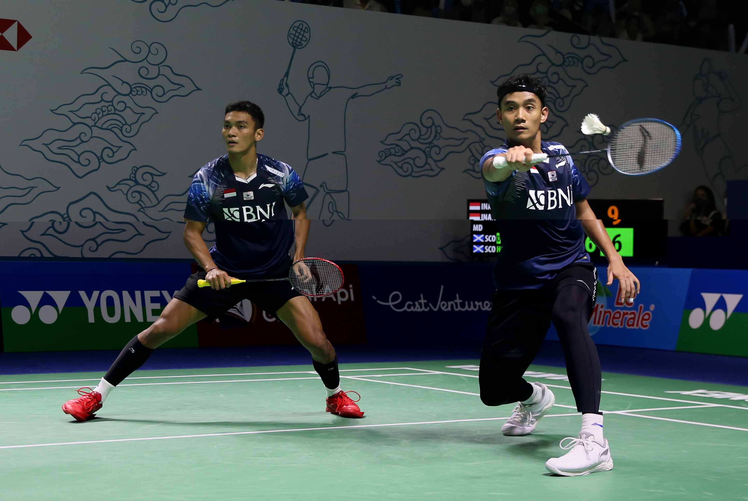 Muhammad Shohibul Fikri/Bagas Maulana (INA) mengalahkan ganda putra Skotlandia, Alexander Dunn/Adam Hall dua gim langsung 21-16 21-16 pada babak pertama gelaran turnamen bulutangkis East Ventures Indonesia Open 2022 di Istora Gelora Bung Karno Senayan, Jakarta, 15 Juni 2022 (Foto : HO/Humas PP PBSI/Erly Bahtiar/Sportsmoment),