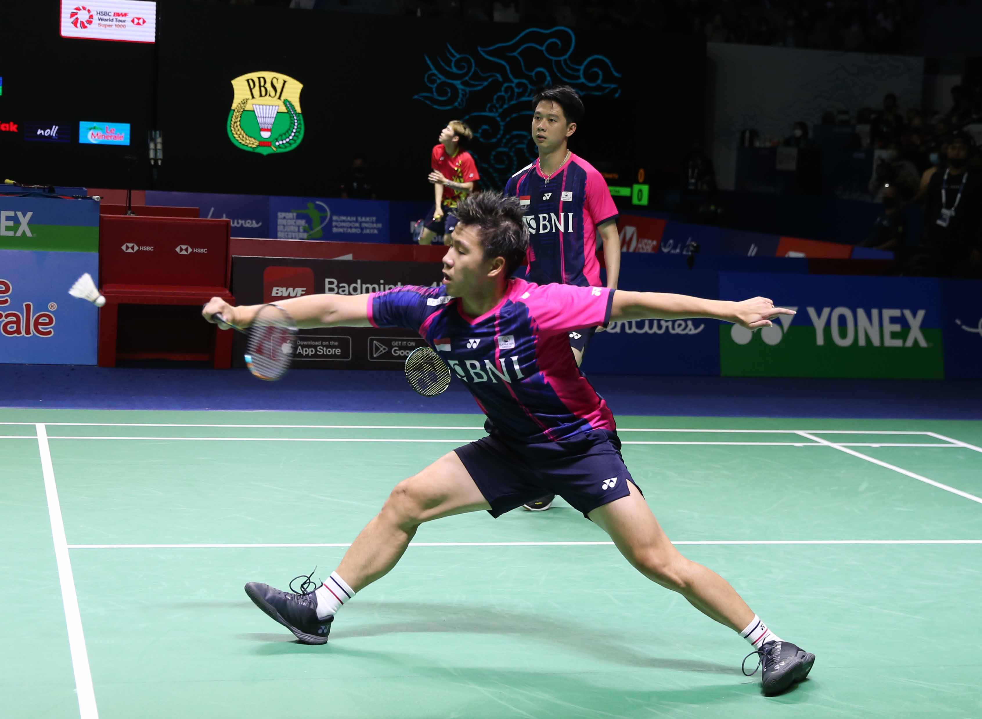 Marcus Fernaldi Gideon/Kevin Sanjaya Sukamuljo (INA) dikalahkan ganda putra Korea, Kang Min Hyuk/Seo Seung Jae dua gim langsung, 14-21, 12-21 pada babak kedua gelaran turnamen bulutangkis East Ventures Indonesia Open 2022 di Istora Gelora Bung Karno Senayan, Jakarta, 16 Juni 2022 (Foto : HO/Humas PP PBSI/Erly Bahtiar/Sportsmoment),