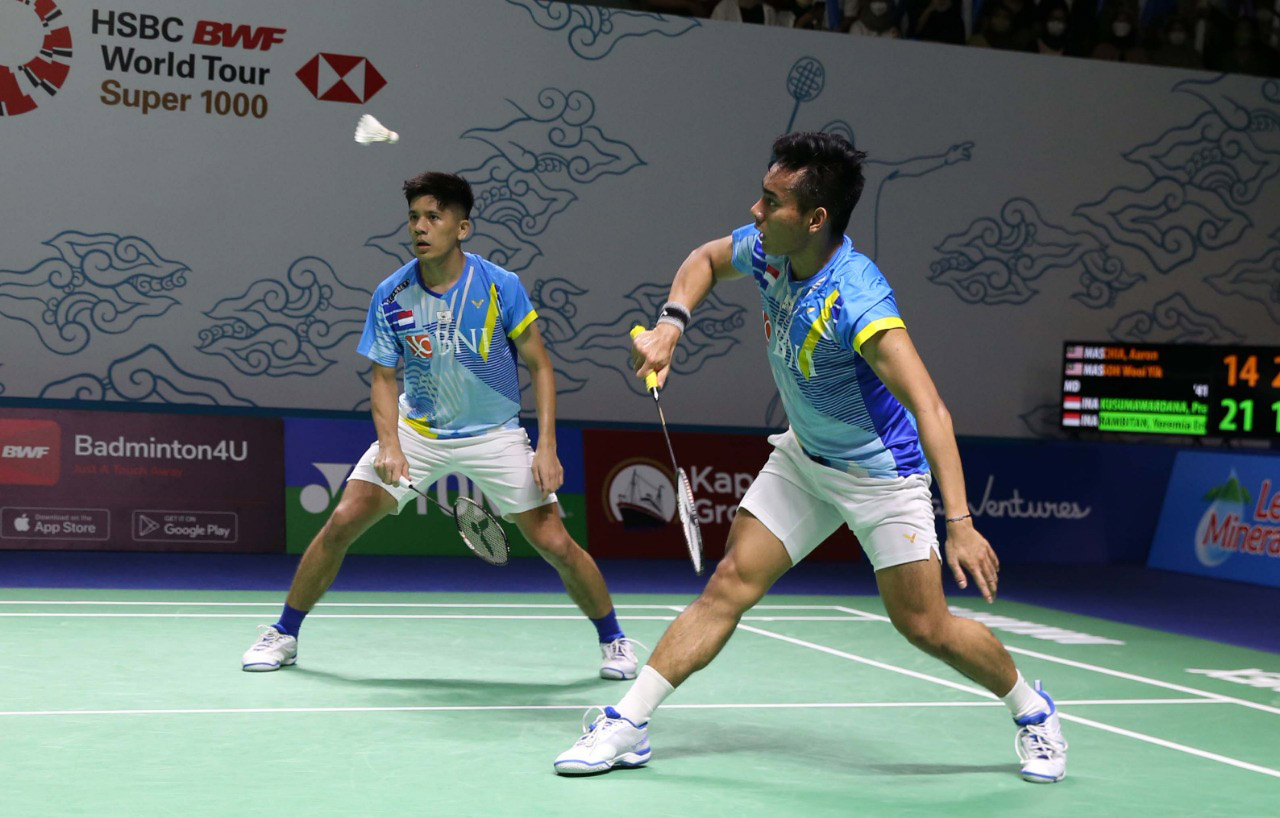 Pramudya Kusumawardana/Yeremia Erich Yoche Yacob Rambitan (INA) dikalahkan ganda putra Malaysia, Aaron Chia/Soh Wooi Yik melalui pertarungan tiga gim, 21-14, 12-21 dan 20-22 pada babak perempatfinal gelaran turnamen bulutangkis East Ventures Indonesia Open 2022 di Istora Gelora Bung Karno Senayan, Jakarta, 17 Juni 2022 (Foto : HO/Humas PP PBSI/Erly Bahtiar/Sportsmoment)