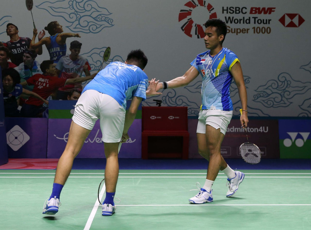 Pramudya Kusumawardana/Yeremia Erich Yoche Yacob Rambitan (INA) dikalahkan ganda putra Malaysia, Aaron Chia/Soh Wooi Yik melalui pertarungan tiga gim, 21-14, 12-21 dan 20-22 pada babak perempatfinal gelaran turnamen bulutangkis East Ventures Indonesia Open 2022 di Istora Gelora Bung Karno Senayan, Jakarta, 17 Juni 2022 (Foto : HO/Humas PP PBSI/Erly Bahtiar/Sportsmoment)