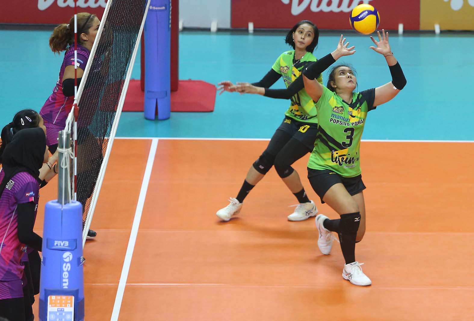 Guedpard Pornpun (3) pemain tim putri Jakarta Mandiri Popsivo Polwan memberikan umpa ke rekannya. Timnya harus mengakui keunggulan Jakarta Pertamina Fastron dengan skor 3-1 (19-25, 25-18, 25-14, dan 25-19) dalam pertandingan Proliga 2022 pekan kedua putaran pertama, di Padepokan Voli Jenderal Polisi Kunarto, Sentul, Bogor, Jumat, 14 Januari 2022. (Foto : Erly Bahtiar/Sportsmoment.id)