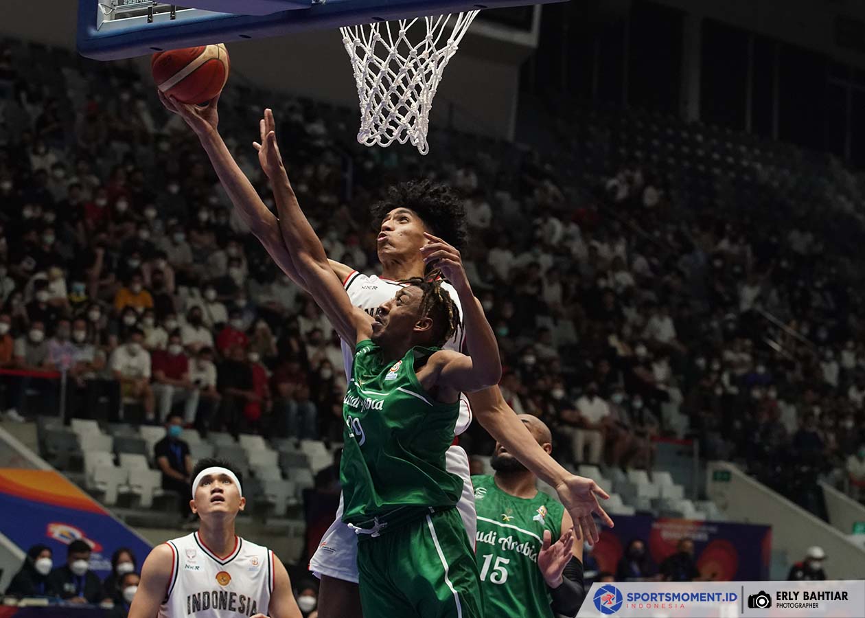 Derric Michael Xzavierro [1] pebasket Tim Nasional (Timnas) saat melawan Arab Saudi di Kualifikasi FIBA World Cup 2023 yang berlangsung, Jumat (1/7/2022) malam WIB di Istora Senayan Jakarta. Bermain di hadapan pendukung sendiri, Timnas Basket Indonesia tumbang dengan skor tipis 67-69 dari Arab Saudi.