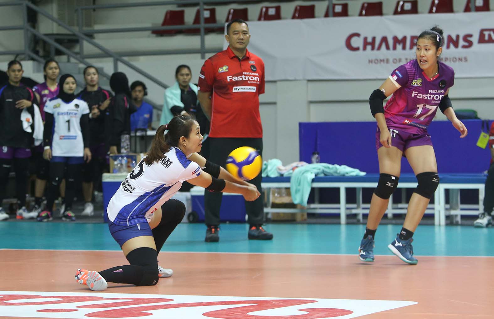 Berllian Marsheila (5) pemain tim putri Jakarta Pertamina Fastron mengembalikan bola lawan.