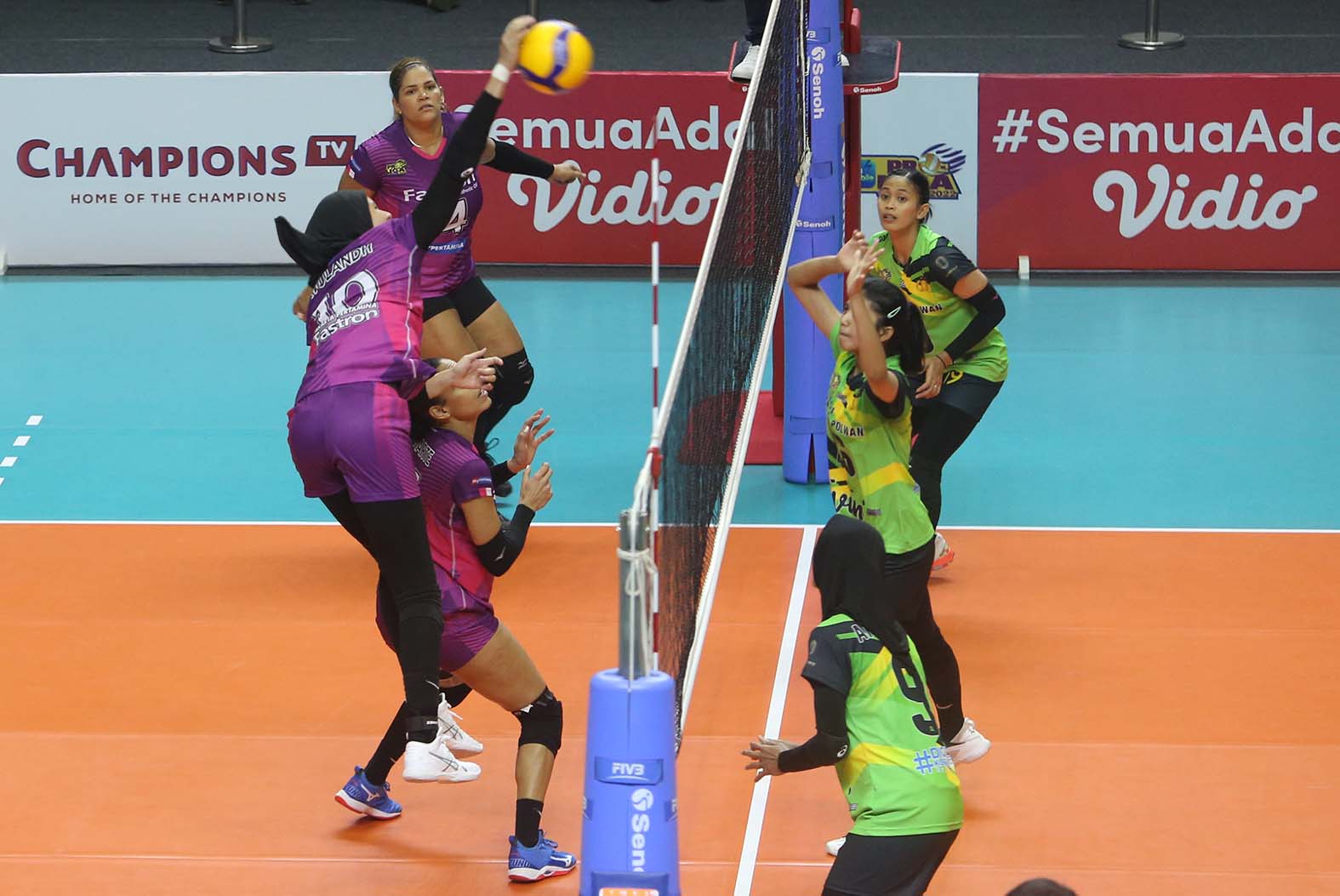 Agustin wulandari (10) pemain tim putri Jakarta Pertamina Fastron melakukan smash. Jakarta Pertamina Fastron berhasil mengalahkan Jakarta Mandiri Popsivo Polwan dengan skor 3-1 (19-25, 25-18, 25-14, dan 25-19) dalam pertandingan Proliga 2022 pekan kedua putaran pertama, di Padepokan Voli Jenderal Polisi Kunarto, Sentul, Bogor, Jumat, 14 Januari 2022. (Foto : Erly Bahtiar/Sportsmoment.id)