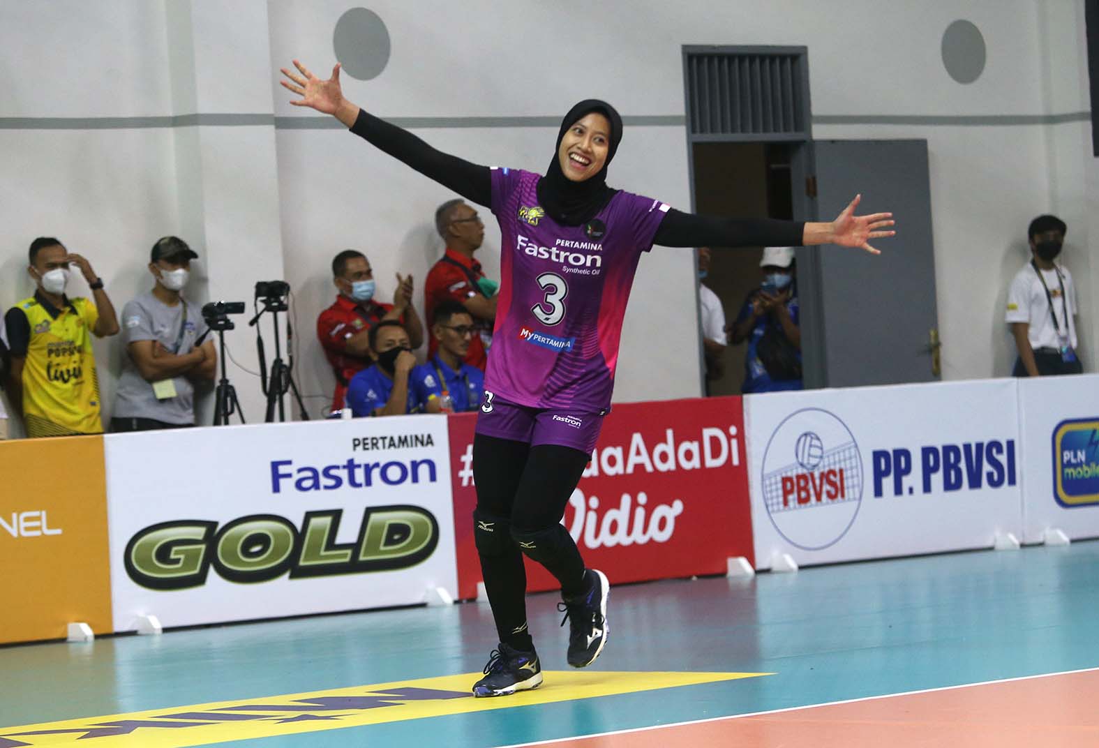 Megawati Hangestri Pertiwi (3) pemain tim putri Jakarta Pertamina Fastron meluapkan kegembiraannya dilapangan.