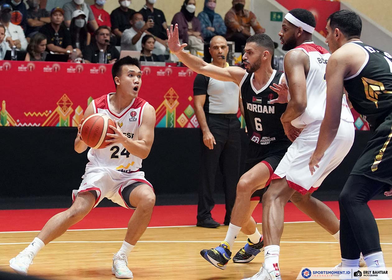 Agassi Yeshe Goantara beraksi saat timnas basket Indonesia melewan Yordania pada laga kedua Grup A FIBA Asia Cup 2022. Pertandingan yang berlangsung di Istora Senayan Jakarta pada Kamis (14/7/2022) tersebut, Indonesia kalah dengan skor 65-74. (Foto: Sportsmoment.id/Erly Bahtiar)