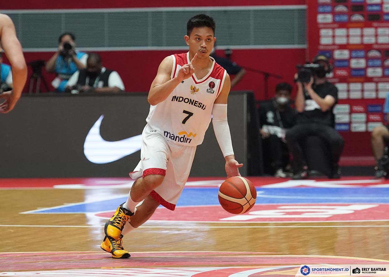 Andakara Prastawa Dhyaksa beraksi saat timnas basket Indonesia melewan Yordania pada laga kedua Grup A FIBA Asia Cup 2022. Pertandingan yang berlangsung di Istora Senayan Jakarta pada Kamis (14/7/2022) tersebut, Indonesia kalah dengan skor 65-74. (Foto: Sportsmoment.id/Erly Bahtiar)