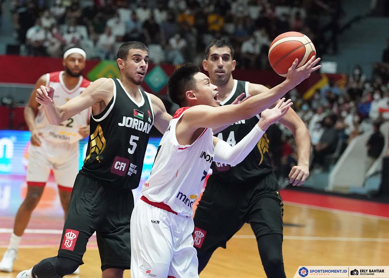 Andakara Prastawa Dhyaksa beraksi saat timnas basket Indonesia melewan Yordania pada laga kedua Grup A FIBA Asia Cup 2022. Pertandingan yang berlangsung di Istora Senayan Jakarta pada Kamis (14/7/2022) tersebut, Indonesia kalah dengan skor 65-74. (Foto: Sportsmoment.id/Erly Bahtiar)