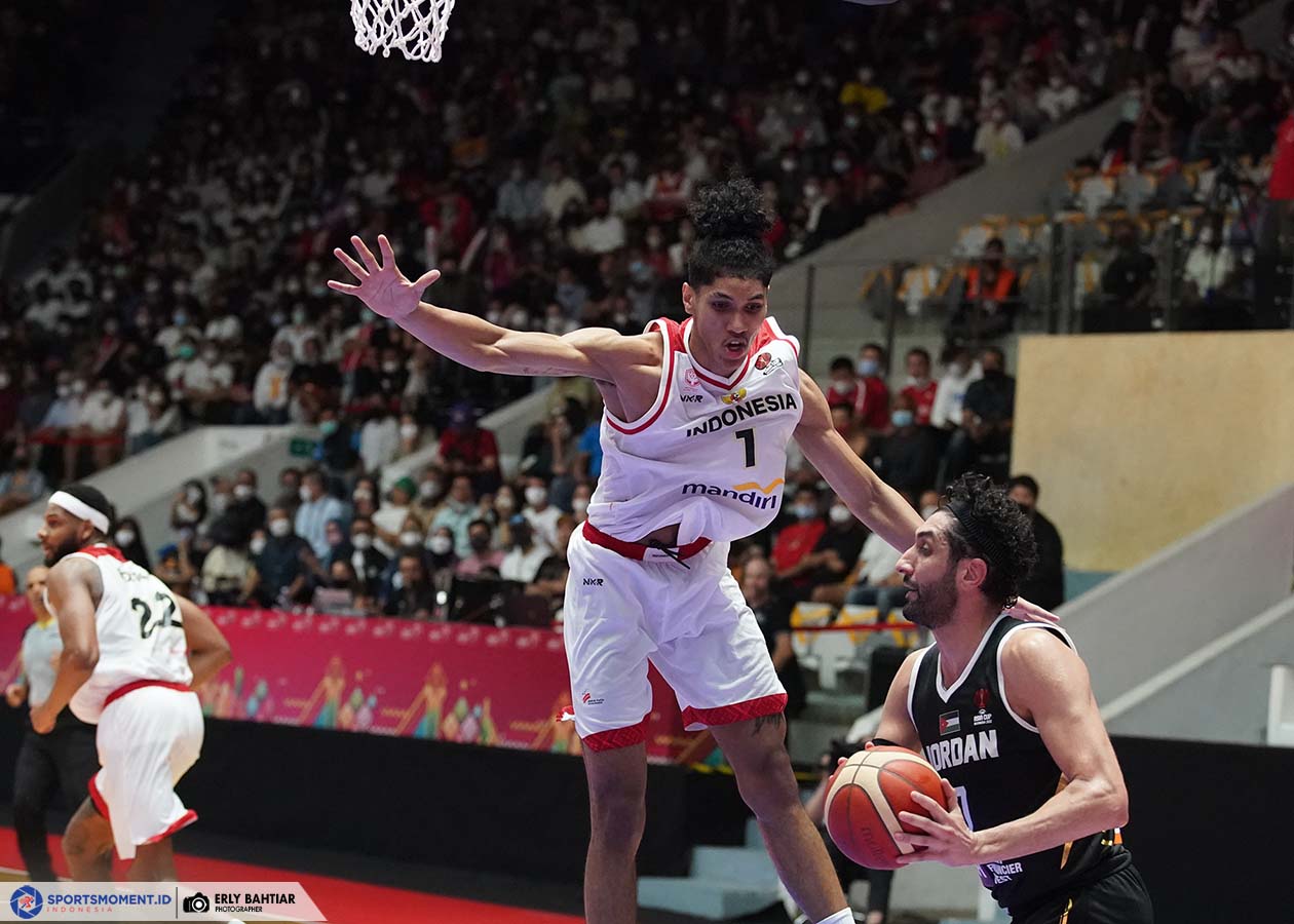 Derrick Michael Xzavierro beraksi saat timnas basket Indonesia melewan Yordania pada laga kedua Grup A FIBA Asia Cup 2022. Pertandingan yang berlangsung di Istora Senayan Jakarta pada Kamis (14/7/2022) tersebut, Indonesia kalah dengan skor 65-74. (Foto: Sportsmoment.id/Erly Bahtiar)