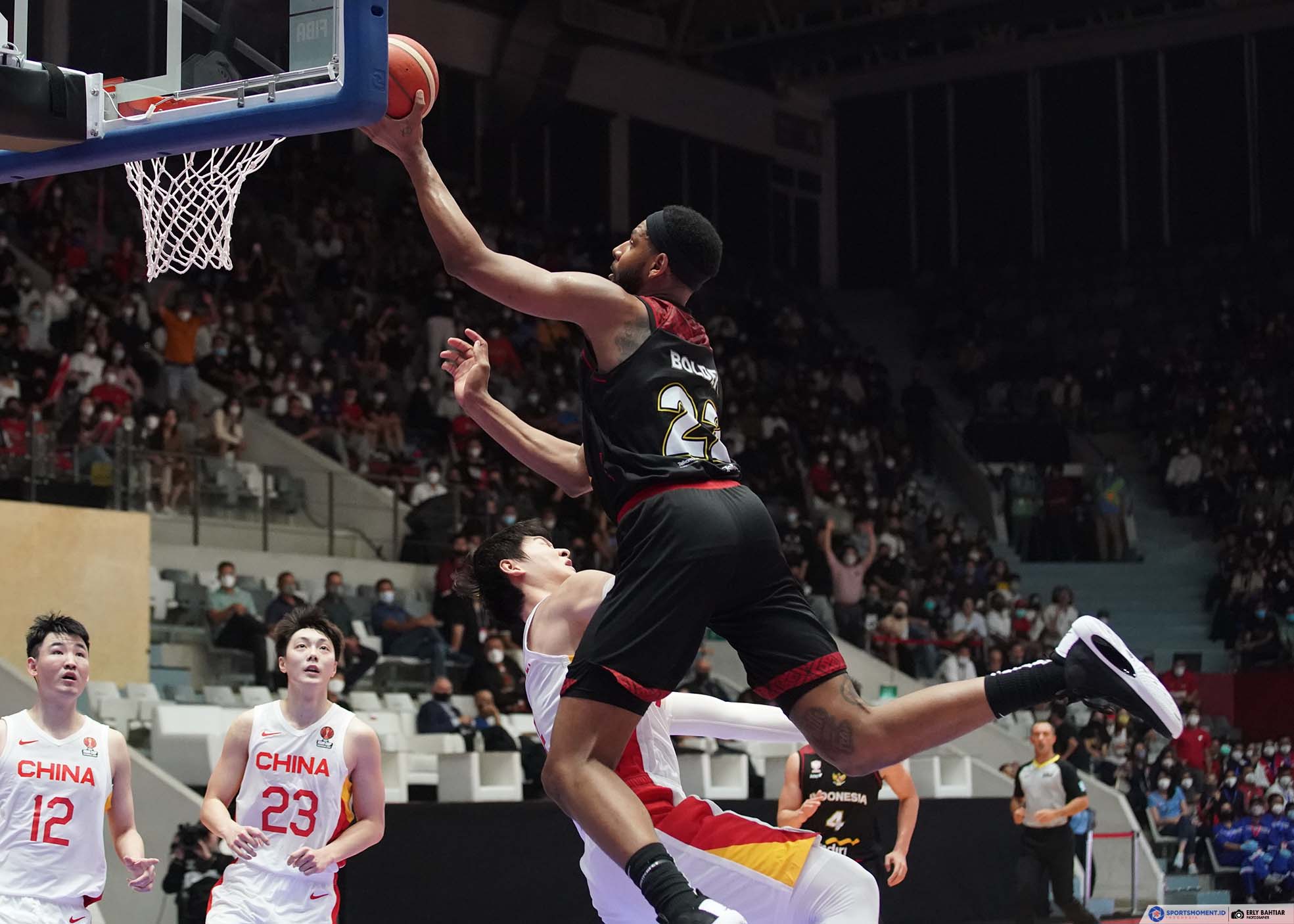 Marques Terrell Bolden beraksi saat timnas basket Indonesia melewan China pada laga kedua Grup A FIBA Asia Cup 2022. Pertandingan yang berlangsung di Istora Senayan Jakarta pada Kamis (14/7/2022) tersebut, Indonesia kalah dengan skor 58-108. (Foto: Sportsmoment.id/Erly Bahtiar)