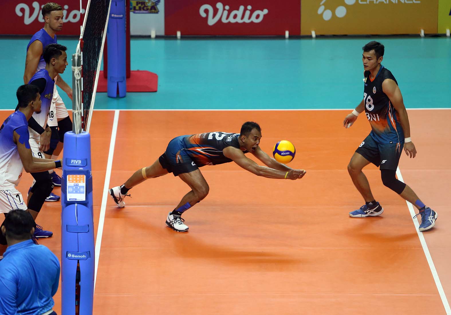 Tim bola voli putra Jakarta BNI 46 menang atas Surabaya Bhayangkara Samator dalam gelaran Proliga 2022 putaran pertama Jumat (14/1/2022) dengan skor 3-2. (32-30, 31-33, 25-20, 24-26, dan 17-15) di GOR Padepokan Voli Jenderal Polisi, Sentul, Bogor. (Foto : Erly Bahtiar/Sportsmoment.id)