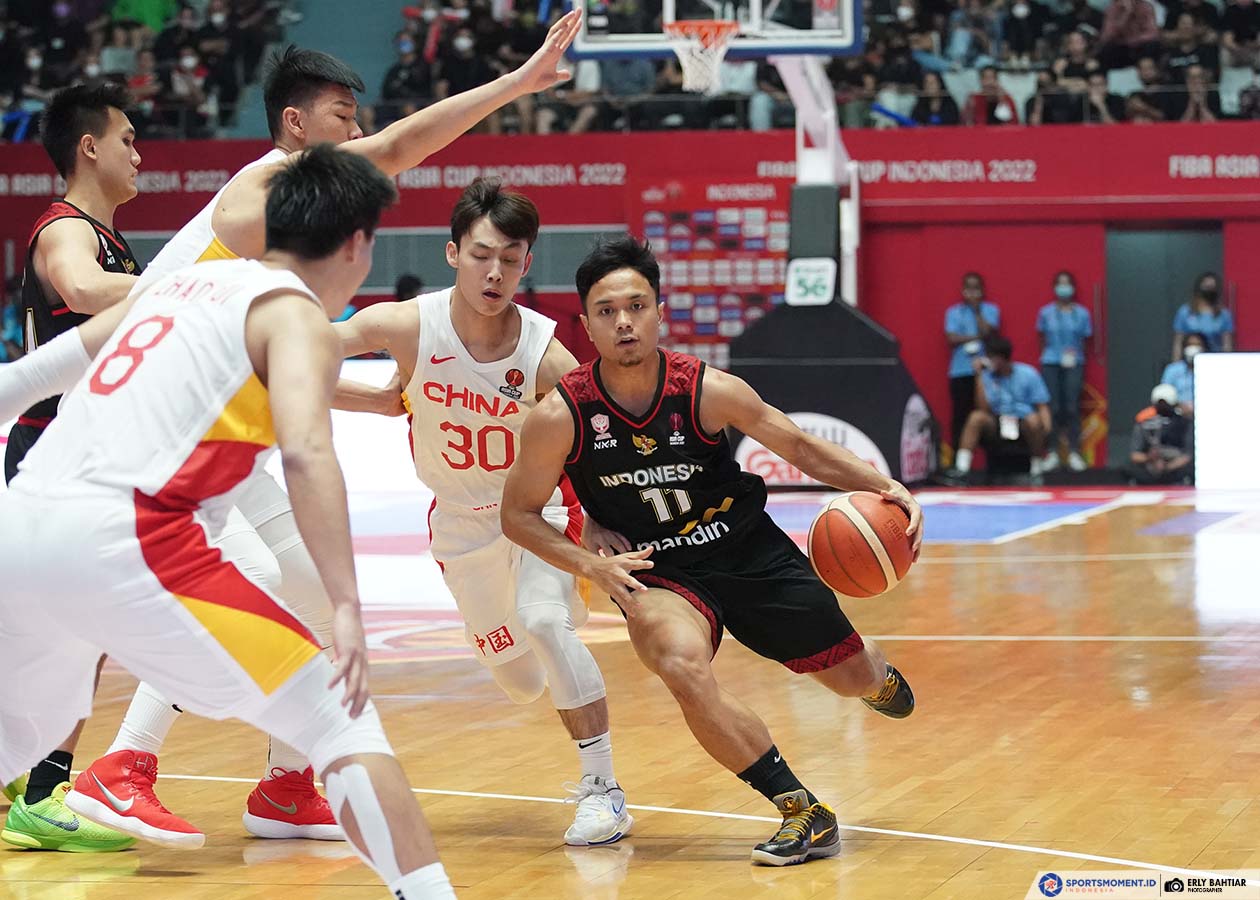 Yudha Saputra beraksi saat timnas basket Indonesia melewan China pada laga kedua Grup A FIBA Asia Cup 2022. Pertandingan yang berlangsung di Istora Senayan Jakarta pada Kamis (14/7/2022) tersebut, Indonesia kalah dengan skor 58-108. (Foto: Sportsmoment.id/Erly Bahtiar)