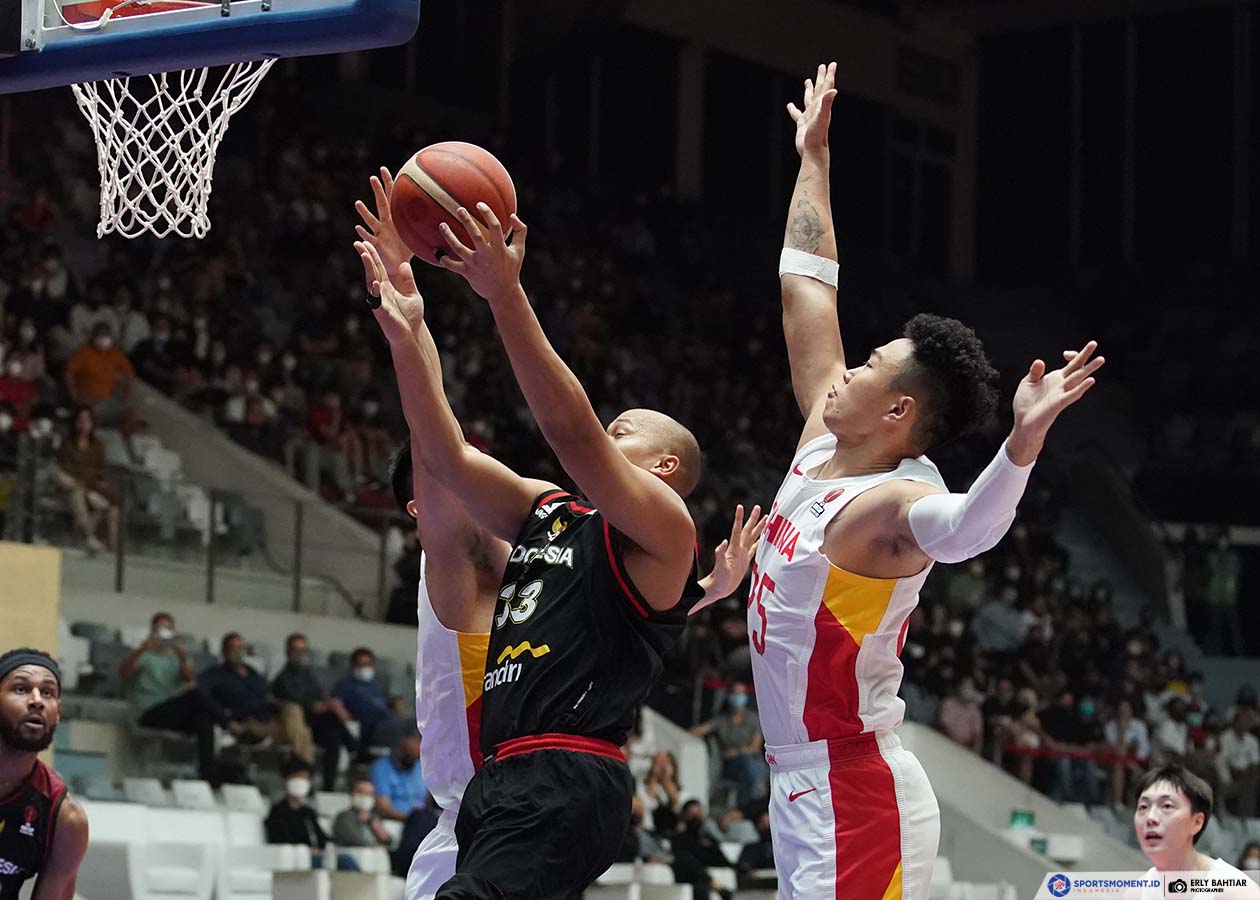 Arki Dikania Wisnu beraksi saat timnas basket Indonesia melewan China pada laga kedua Grup A FIBA Asia Cup 2022. Pertandingan yang berlangsung di Istora Senayan Jakarta pada Kamis (14/7/2022) tersebut, Indonesia kalah dengan skor 58-108. (Foto: Sportsmoment.id/Erly Bahtiar)