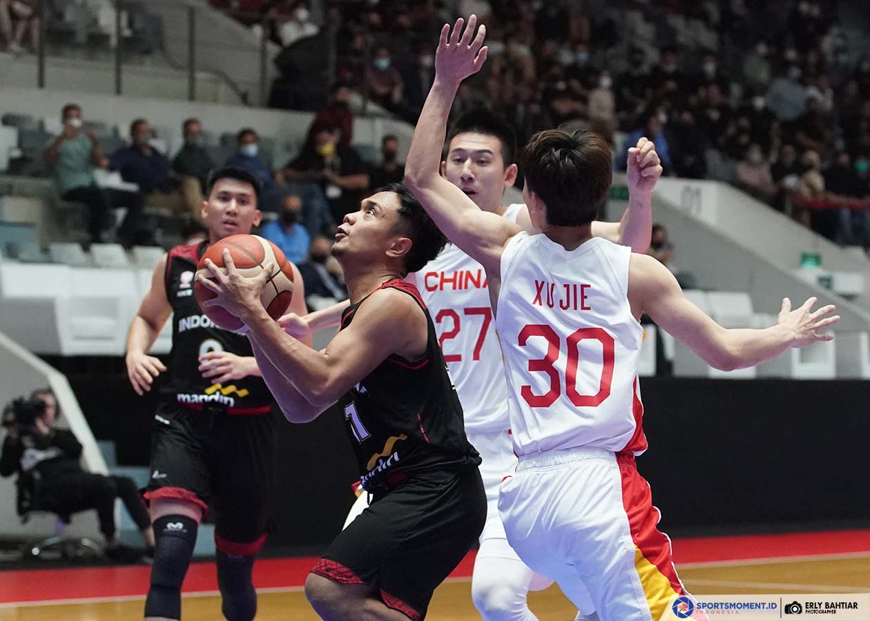 Yudha Saputra beraksi saat timnas basket Indonesia melewan China pada laga kedua Grup A FIBA Asia Cup 2022. Pertandingan yang berlangsung di Istora Senayan Jakarta pada Kamis (14/7/2022) tersebut, Indonesia kalah dengan skor 58-108. (Foto: Sportsmoment.id/Erly Bahtiar)