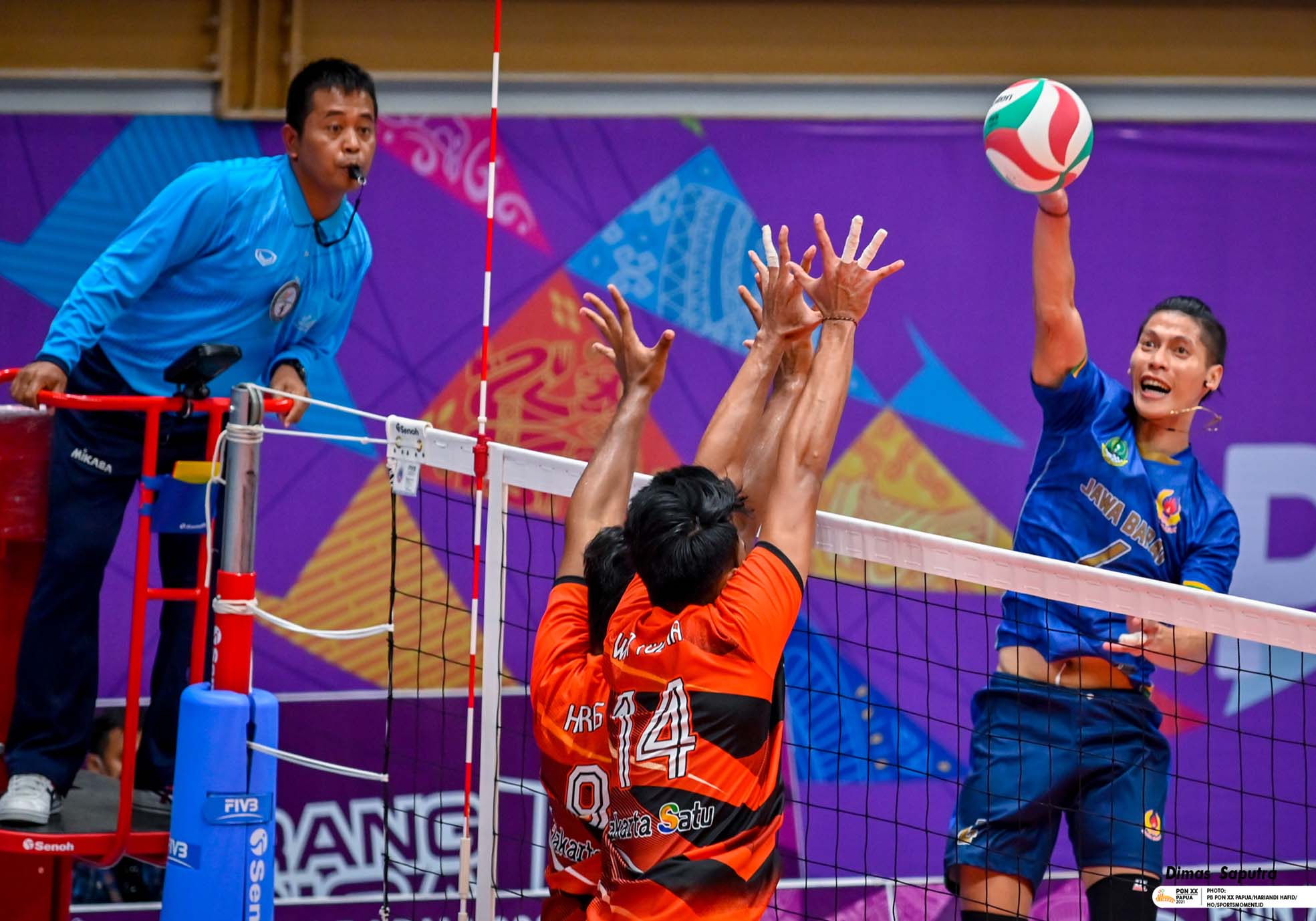 Pemain DKI Jakarta I Gede Wirayudha Putra dan Noviar Haris Saputra berusaha memblok spike yang dilakukan pemain Jawa Barat , Dimas Saputra Pratama saat laga final Bola Voli Putra PON XX Papua di GOR Voli Indoor Koya Koso, Kota Jayapura, Papua, Selasa (12/10/2021).