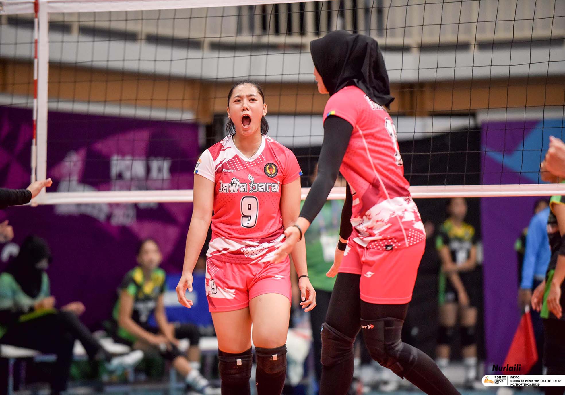 Pemain Voli Putri Jawa Barat Nurlaili (9) mengekspresikan kemenangannya atas Tim Voli Jawa Timur di Venue Voli Koya Koso pada babak penyisihan, Minggu (3/10/2021). Foto: PB PON XX PAPUA/Yustha Corithaca.