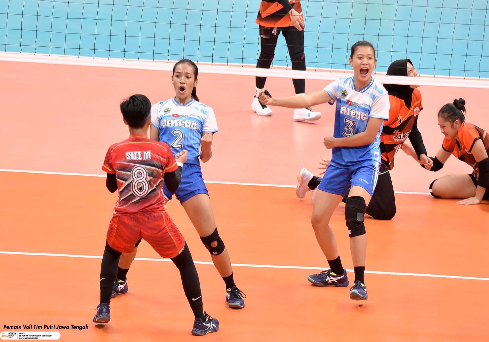 Pemain Voli Tim Putri Jawa Tengah Mengekspresikan Kegembiraannya Ketika Mencetak Angka saat Melawan DKI Jakarta di GOR Voli Koya Koso, Jayapura, Papua, Jumat (8/10/2021) dan menjadikan Kedudukan sama 2-2. (Foto: PB PON XX PAPUA/Yustha Corithaca.)