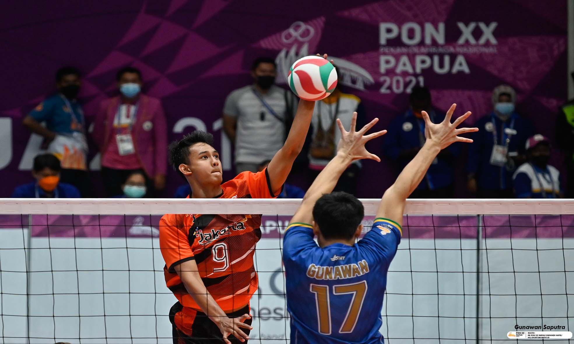 Pemain Jawa Barat Gunawan Saputra berusaha memblok spike yang dilakukan pemain DKI Jakarta Okky Damar Saputra saat laga final Bola Voli Putra PON XX Papua di GOR Voli Indoor Koya Koso, Kota Jayapura, Papua, Selasa (12/10/2021).