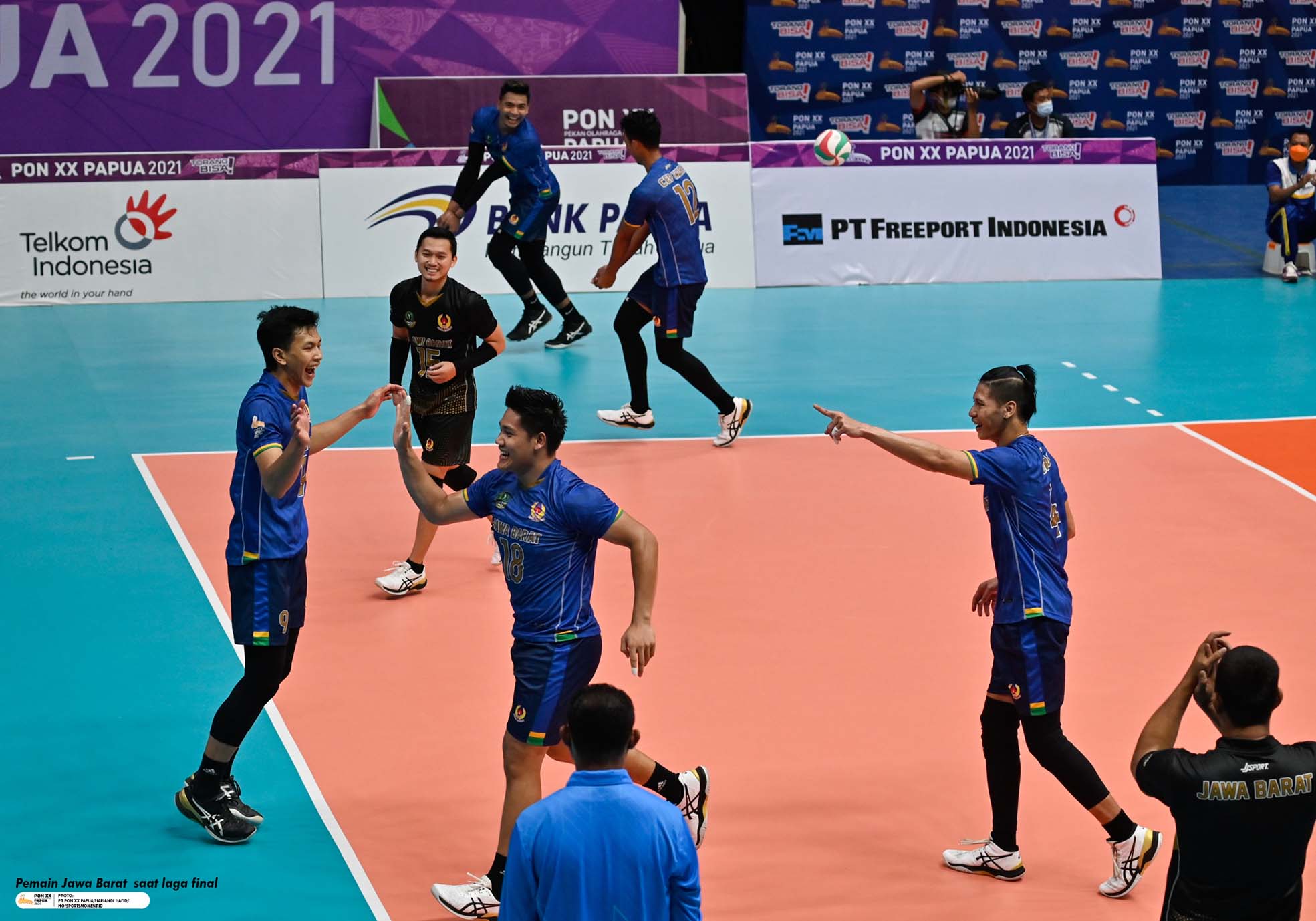 Pemain Jawa Barat saat laga final Bola Voli Putra PON XX Papua di GOR Voli Indoor Koya Koso, Kota Jayapura, Papua, Selasa (12/10/2021). Foto: PON XX PAPUA / HARIANDI HAFID