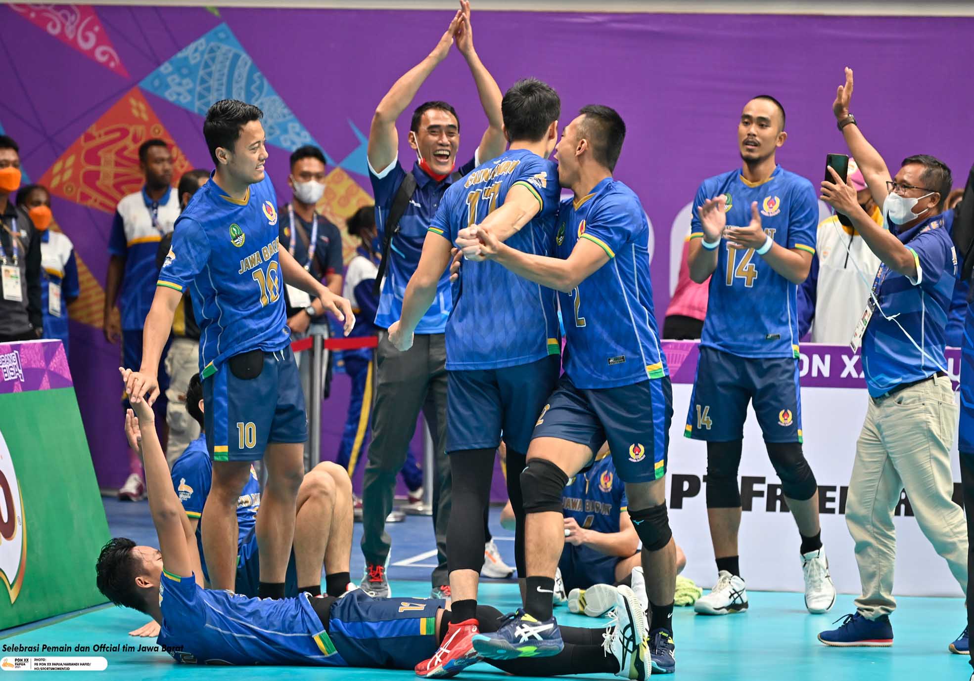 Selebrasi Pemain dan Offcial tim Jawa Barat usai memenangkan laga final Bola Voli Putra PON XX Papua melawan Tim DKI Jakarta di GOR Voli Indoor Koya Koso, Kota Jayapura, Papua, Selasa (12/10/2021). Laga Ini dimenangkan tim Jawa Barat dengan Skor 3-1 (25-15, 25-19,16-15,25-15)