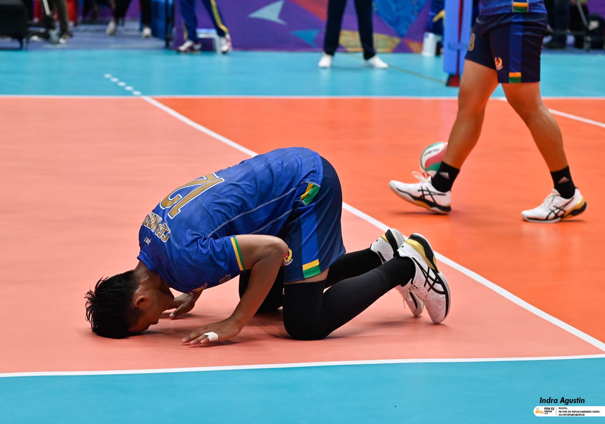 Pemain Jawa Barat Cep Indra Agustin sujud syukur usai memangkan laga final Bola Voli Putra PON XX Papua melawan Tim DKI Jakarta di GOR Voli Indoor Koya Koso, Kota Jayapura, Papua, Selasa (12/10/2021). Laga Ini dimenangkan tim Jawa Barat dengan Skor 3-1 (25-15, 25-19,16-15,25-15)