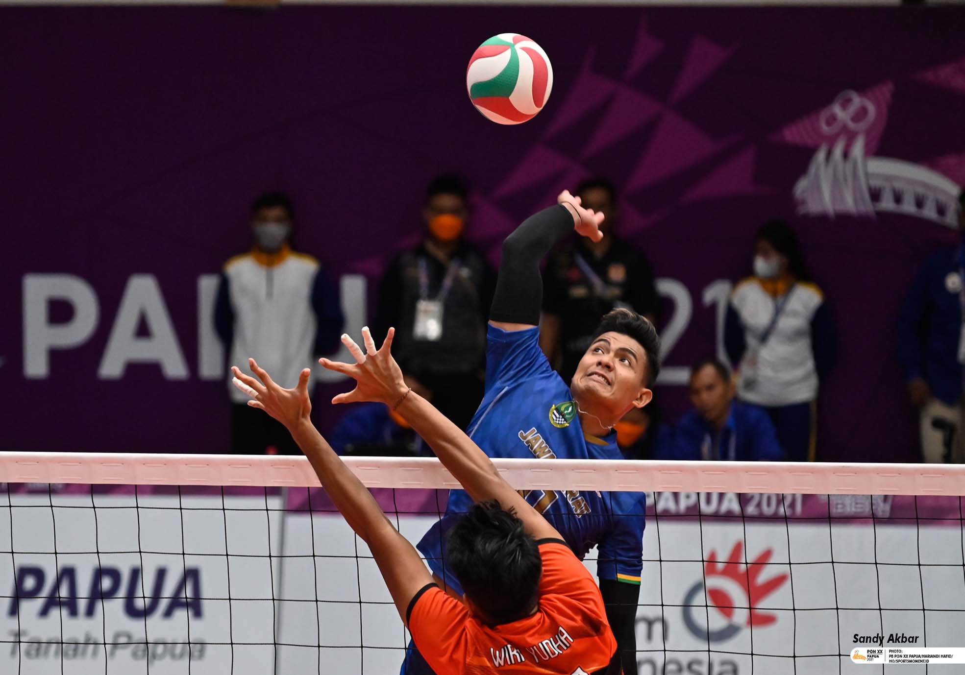 Pemain DKI Jakarta I Gede Wirayudha Putra berusaha memblok spike yang dilakukan pemain Jawa Barat ,Sandy Akbar saat laga final Bola Voli Putra PON XX Papua di GOR Voli Indoor Koya Koso, Kota Jayapura, Papua, Selasa (12/10/2021).