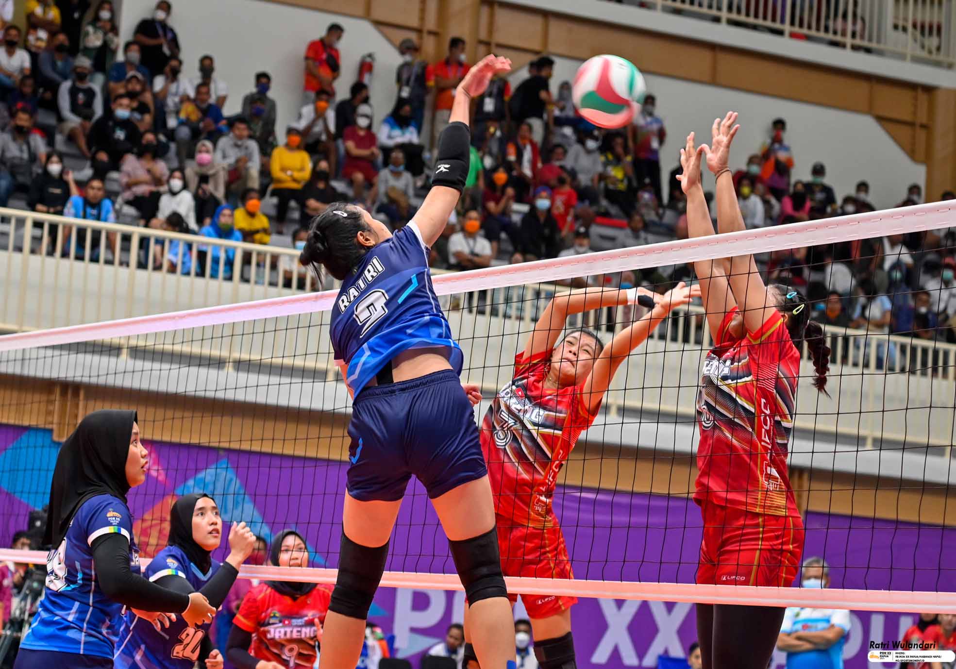 Pemain Jawa Tengah berusaha memblok spike yang dilakukan pemain Jawa Barat Ratri Wulandari saat laga final Bola Voli Putri PON XX Papua di GOR Voli Indoor Koya Koso, Kota Jayapura, Papua, Selasa (12/10/2021). Laga ini dimenangkan oleh tim Jawa Barat dengan Skor 3-0.